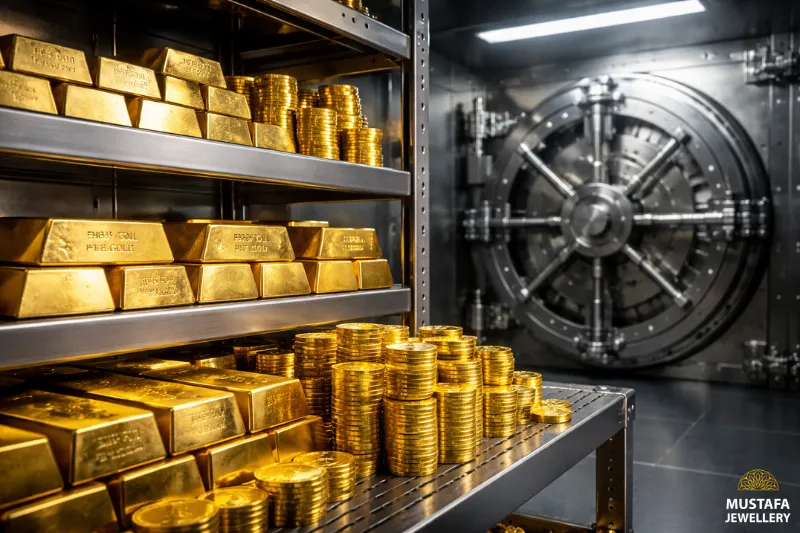 Jewellery can be kept in a secure home safe for convenience. Gold bars are best stored in banks or professional vaults with insurance for added protection.