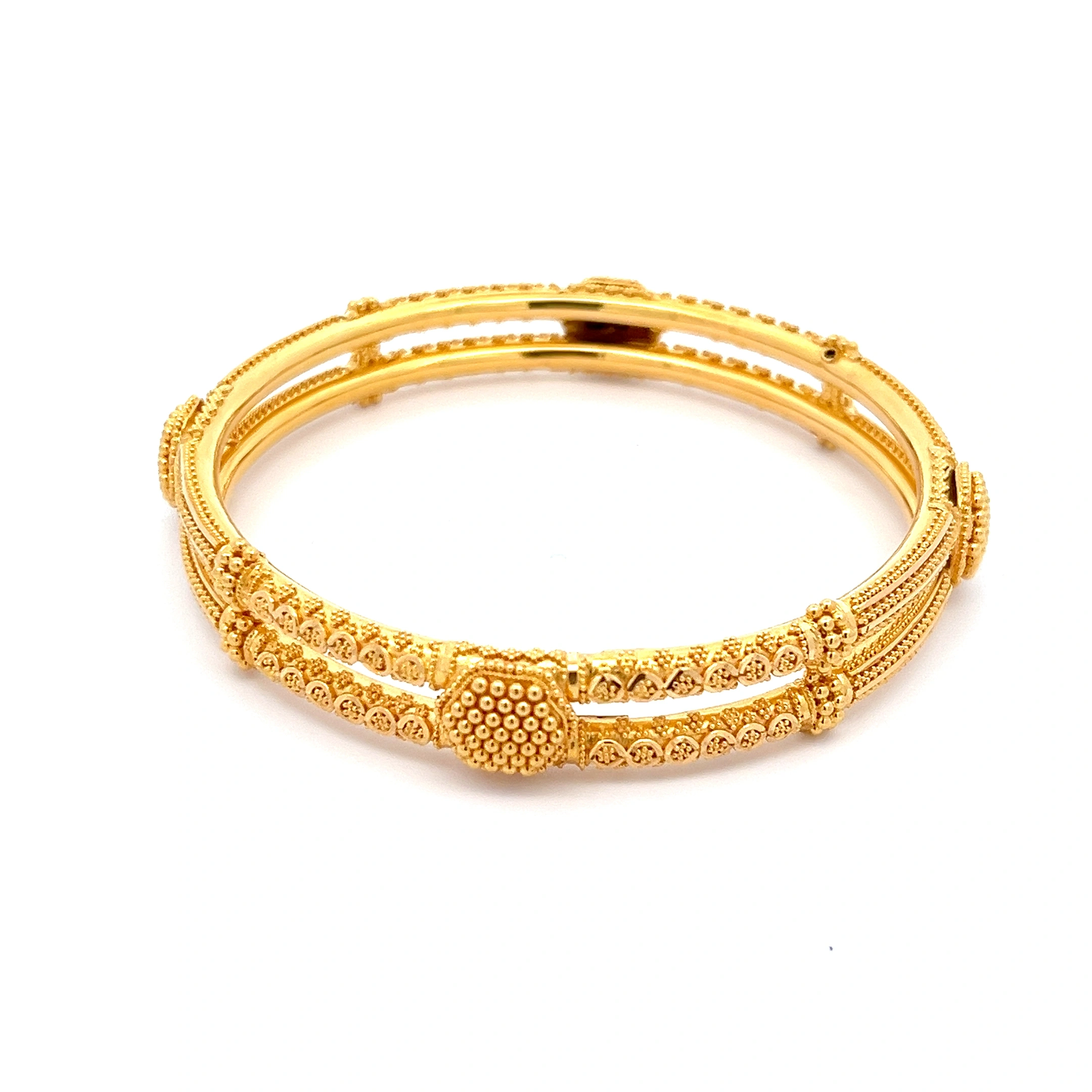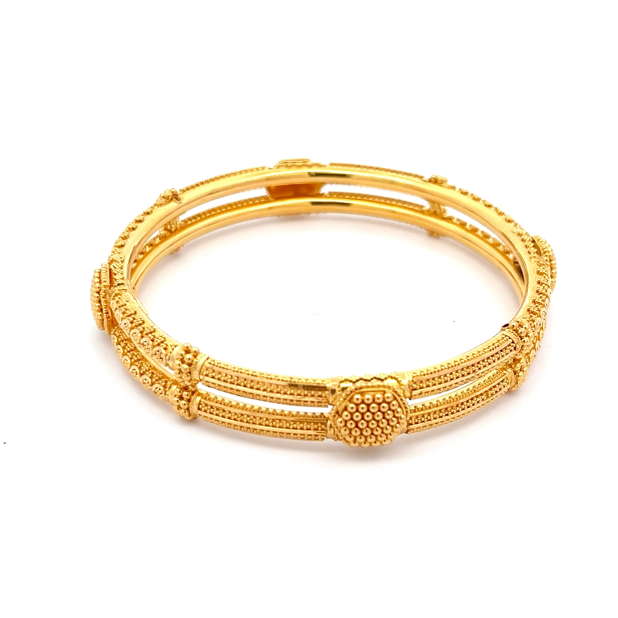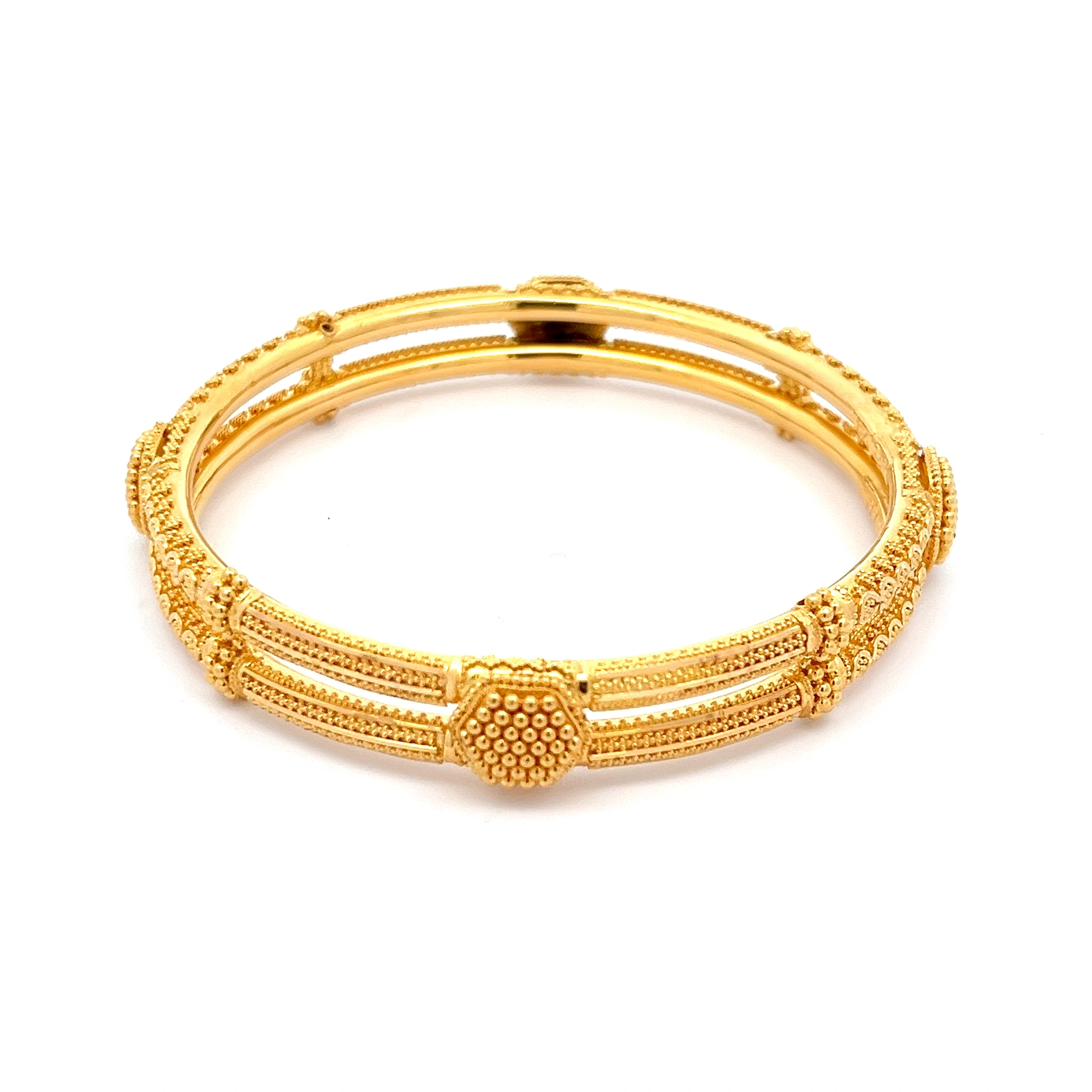 A solid and elegant 916 gold bangle with finely etched and textured patterns, providing a rich, traditional feel and a timeless style.