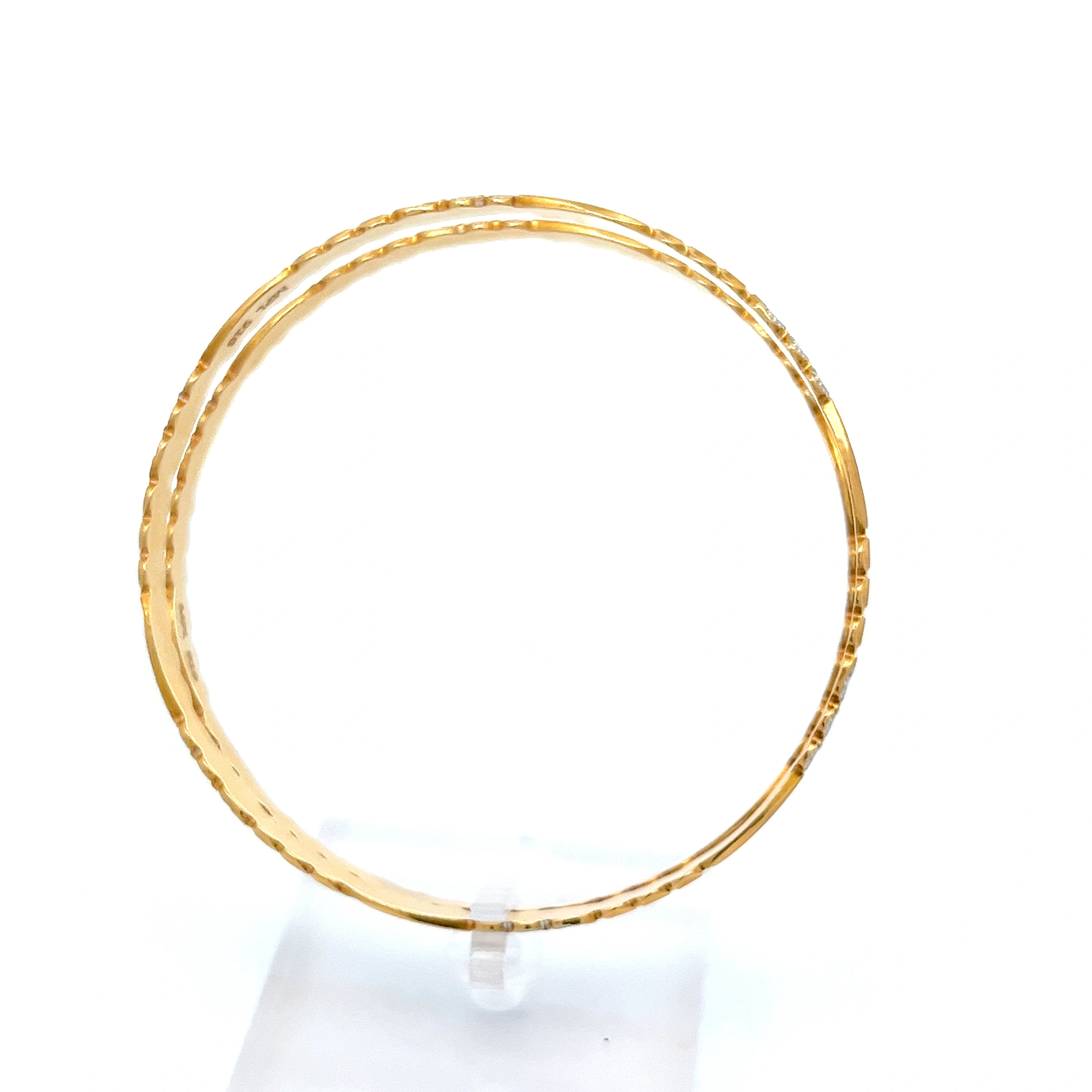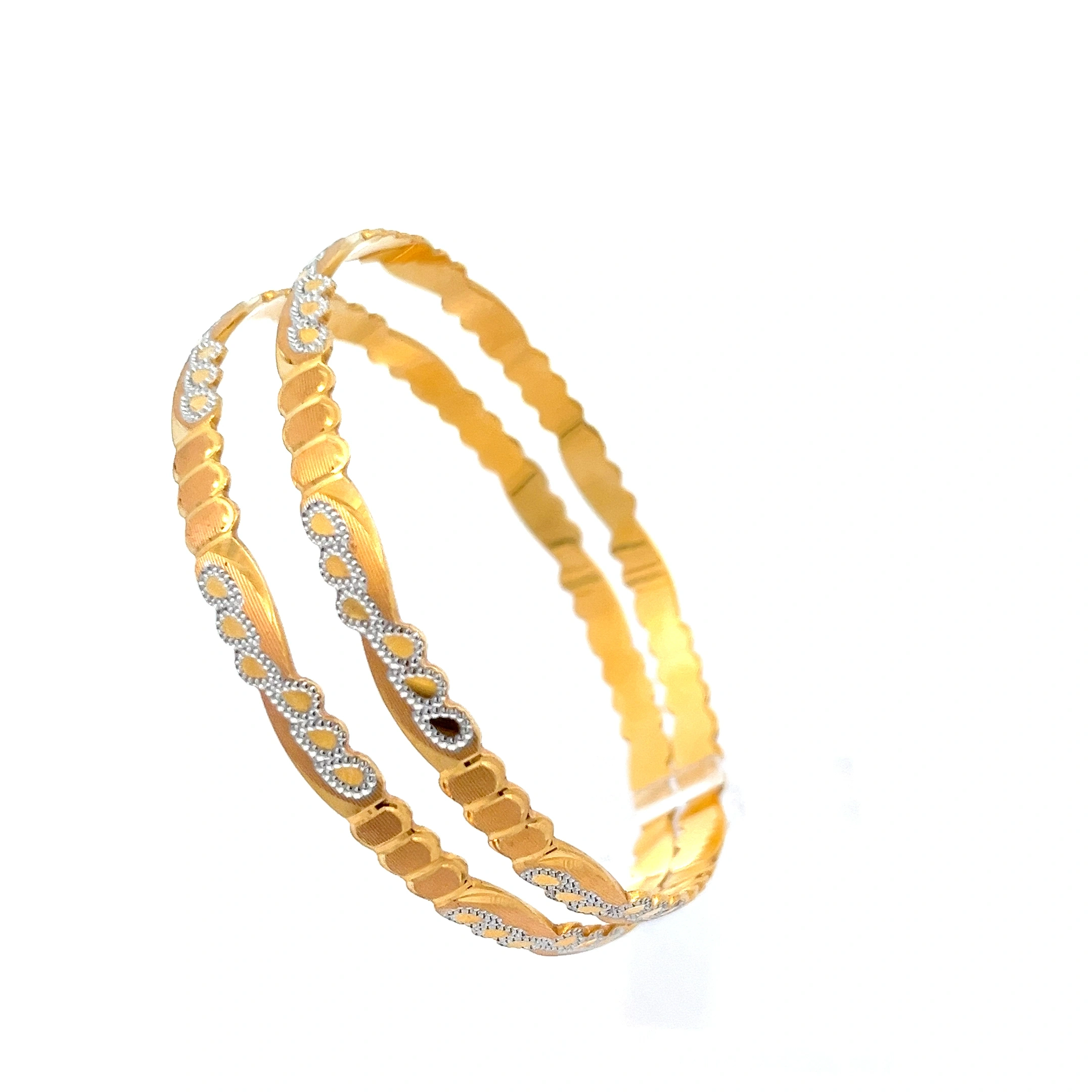 A beautiful pair of bangles featuring a delicate, intertwined design of yellow and white gold, with the white gold sections adorned with shimmer.
