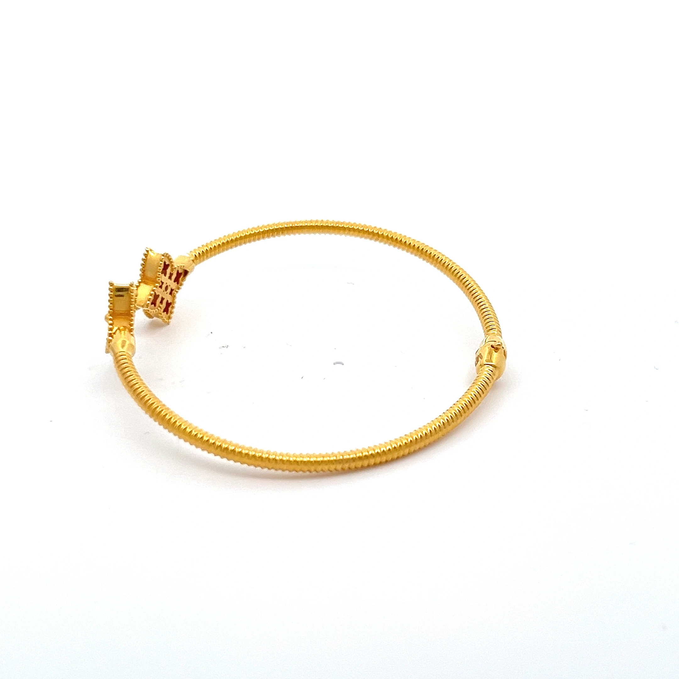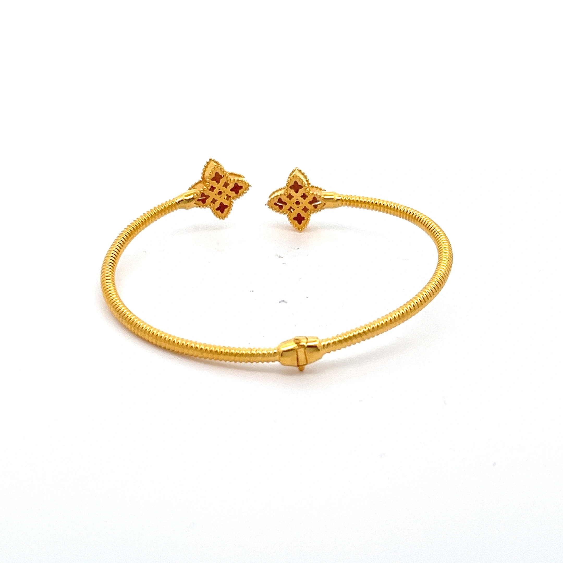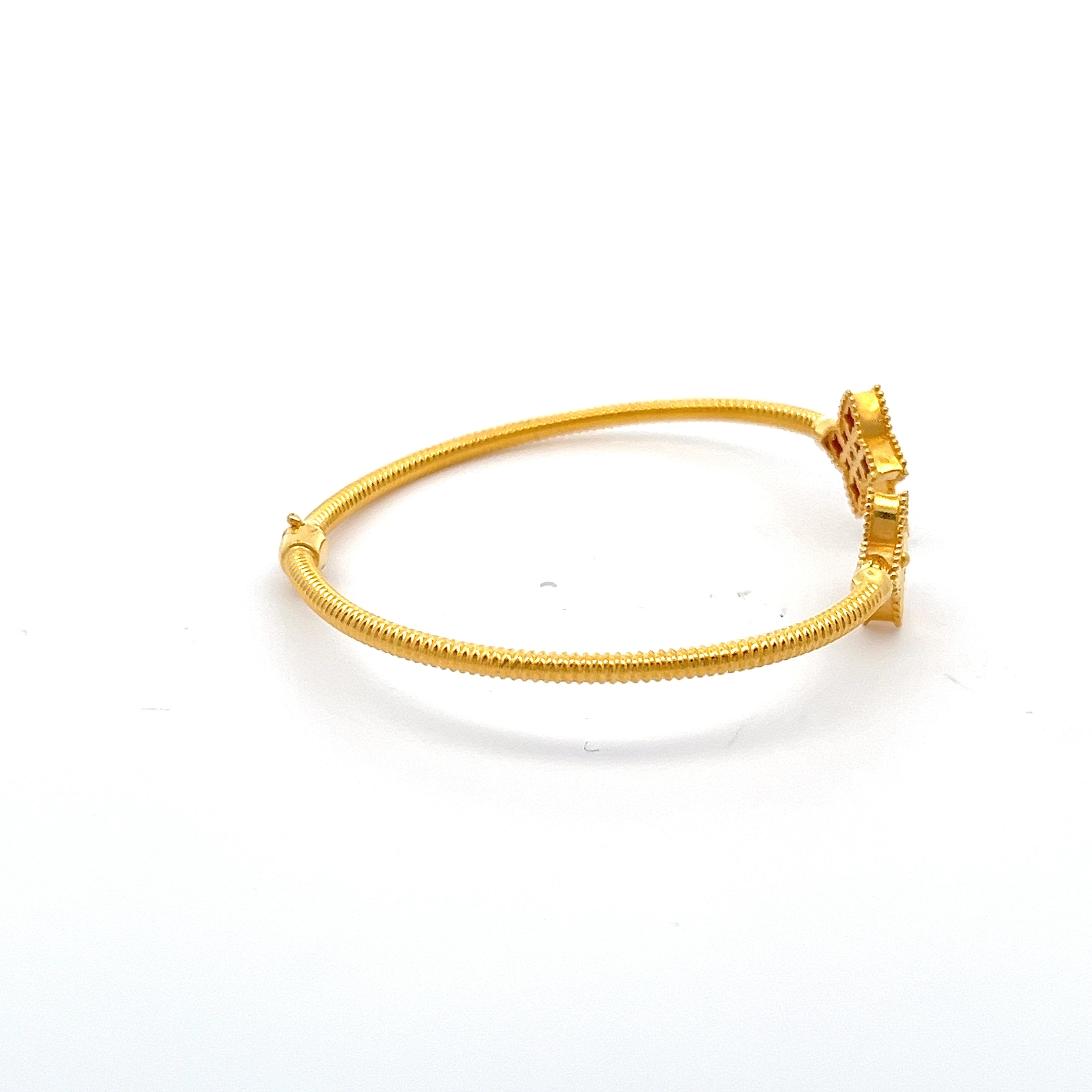 An elegant 916 gold open-ended bangle featuring two beautifully crafted clover motifs. The smooth, polished finish and simple design make it a versatile piece for everyday elegance. It slips on easily and is perfect for stacking or wearing on its own.