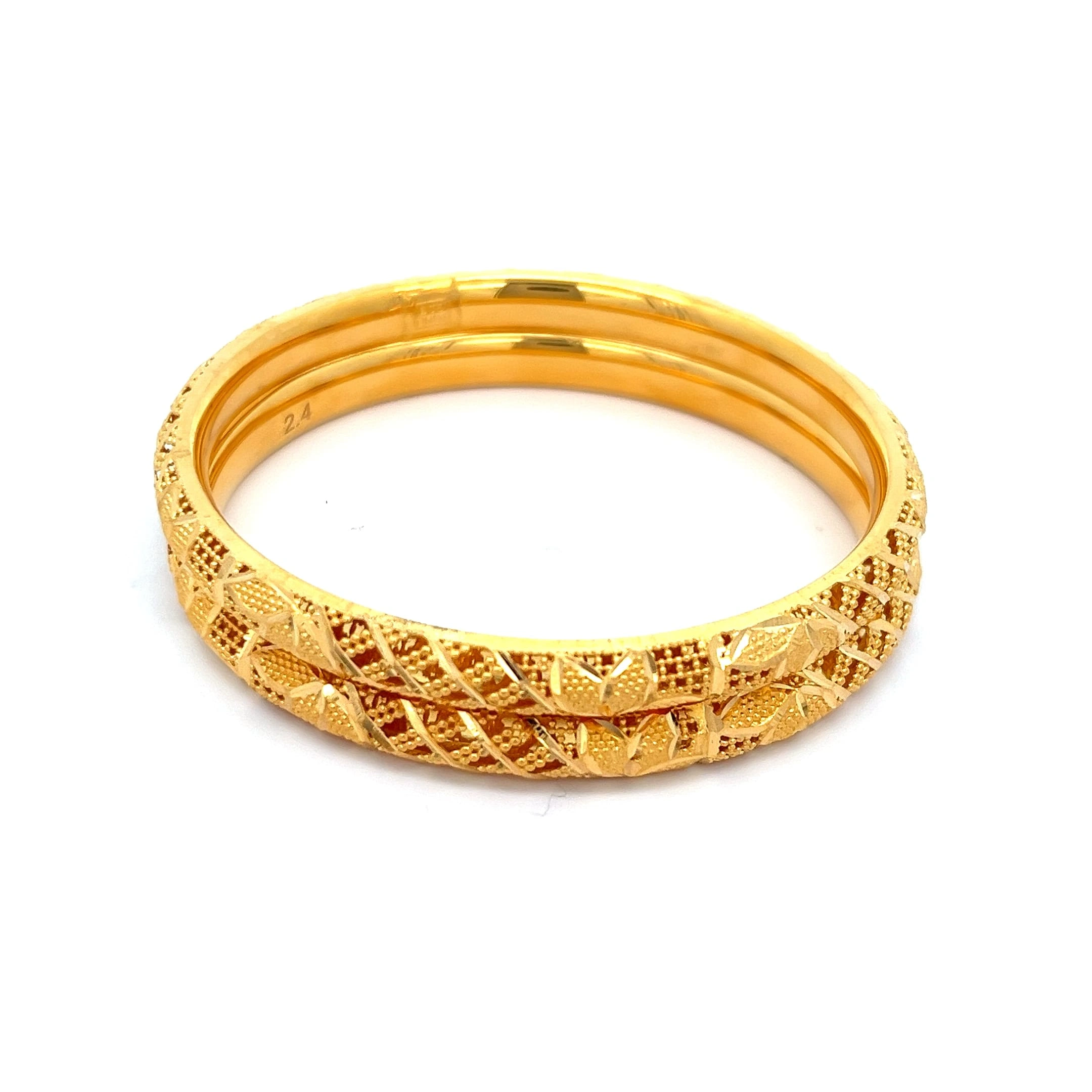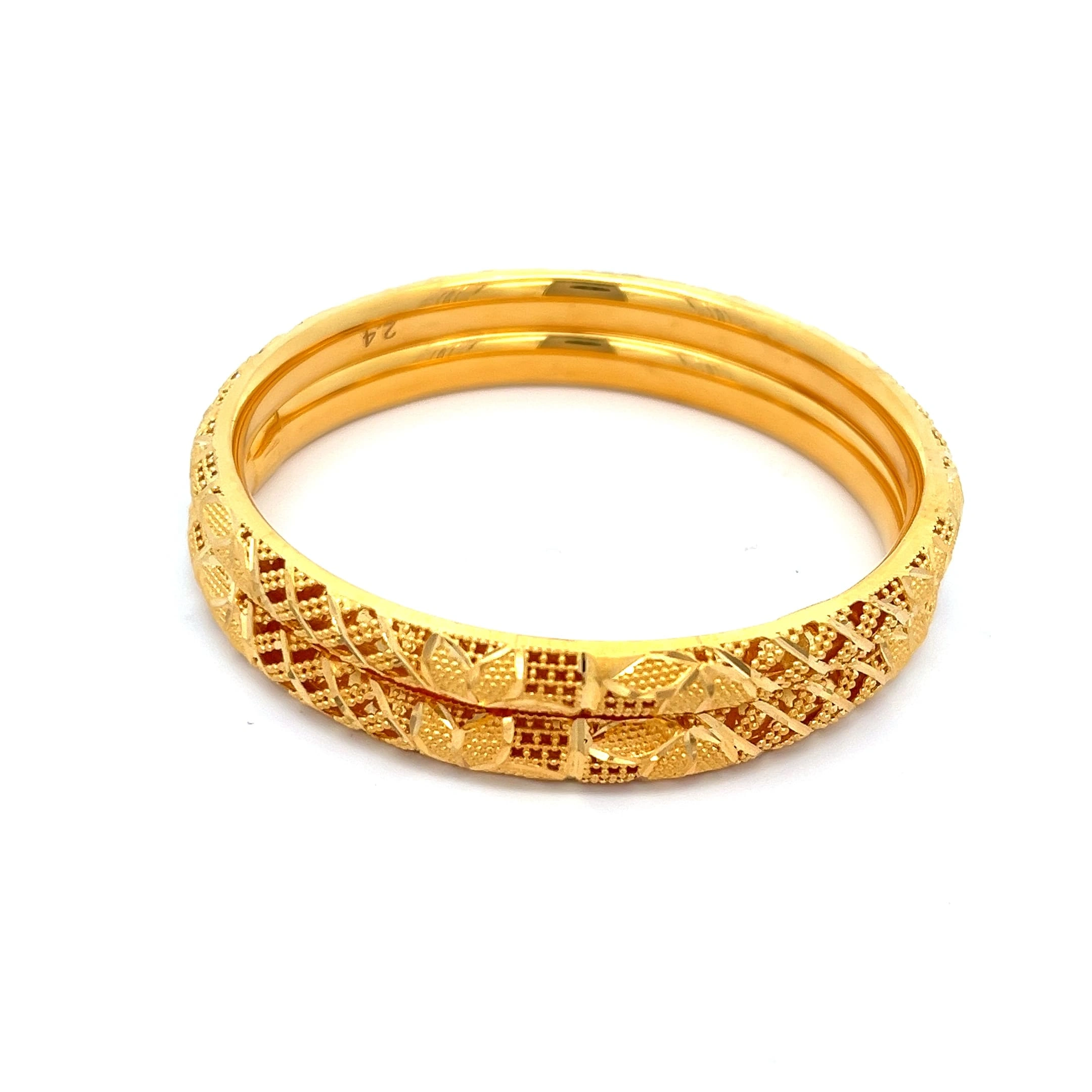 Intricately carved 916 gold bangle with traditional British filigree. The substantial Heritage Glow Bangle (27.9g) offers a rich, vintage statement.