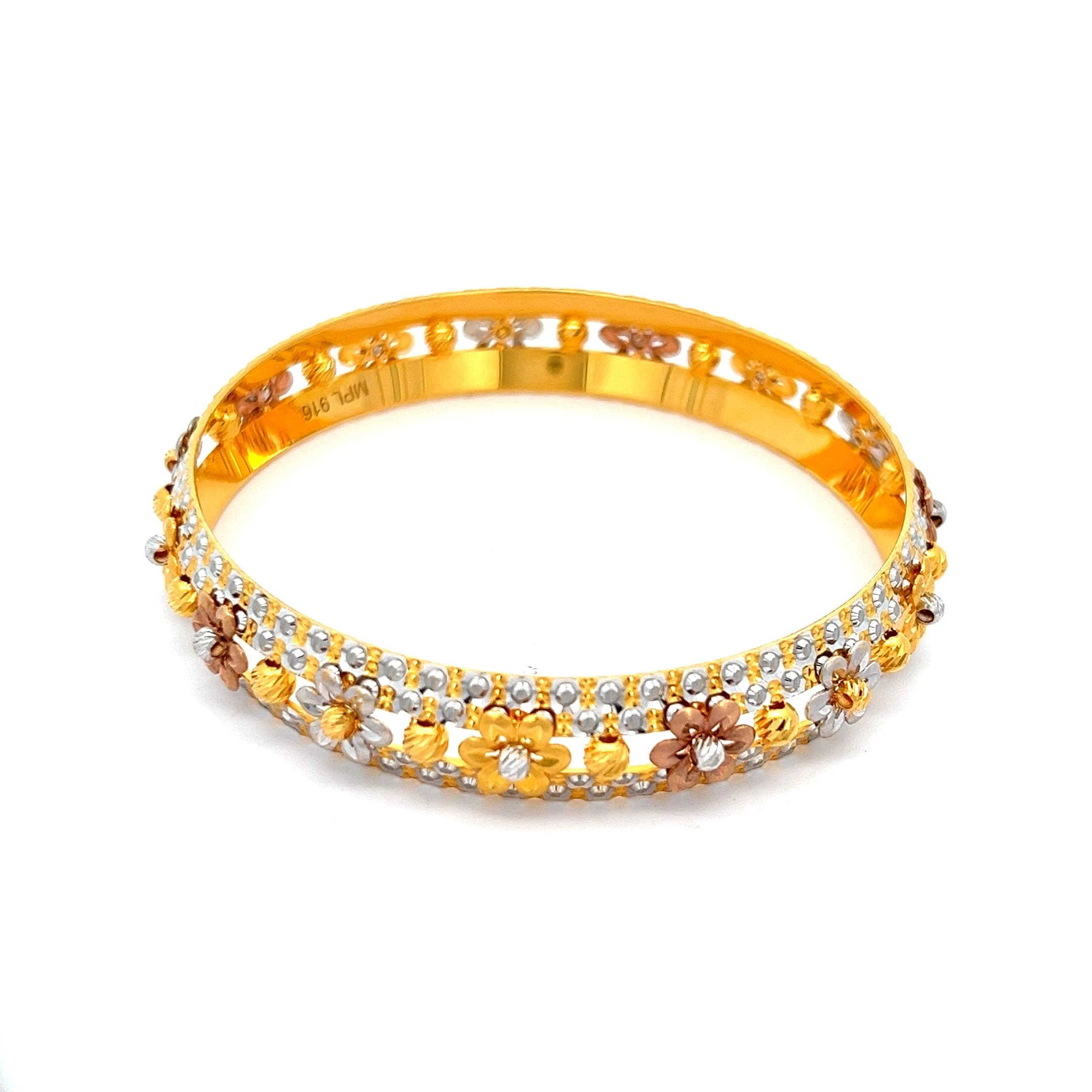 Feminine 916 gold bangle with a continuous floral open-work design. The Floral Blossom Bangle (23.49g) is a light, joyful addition.