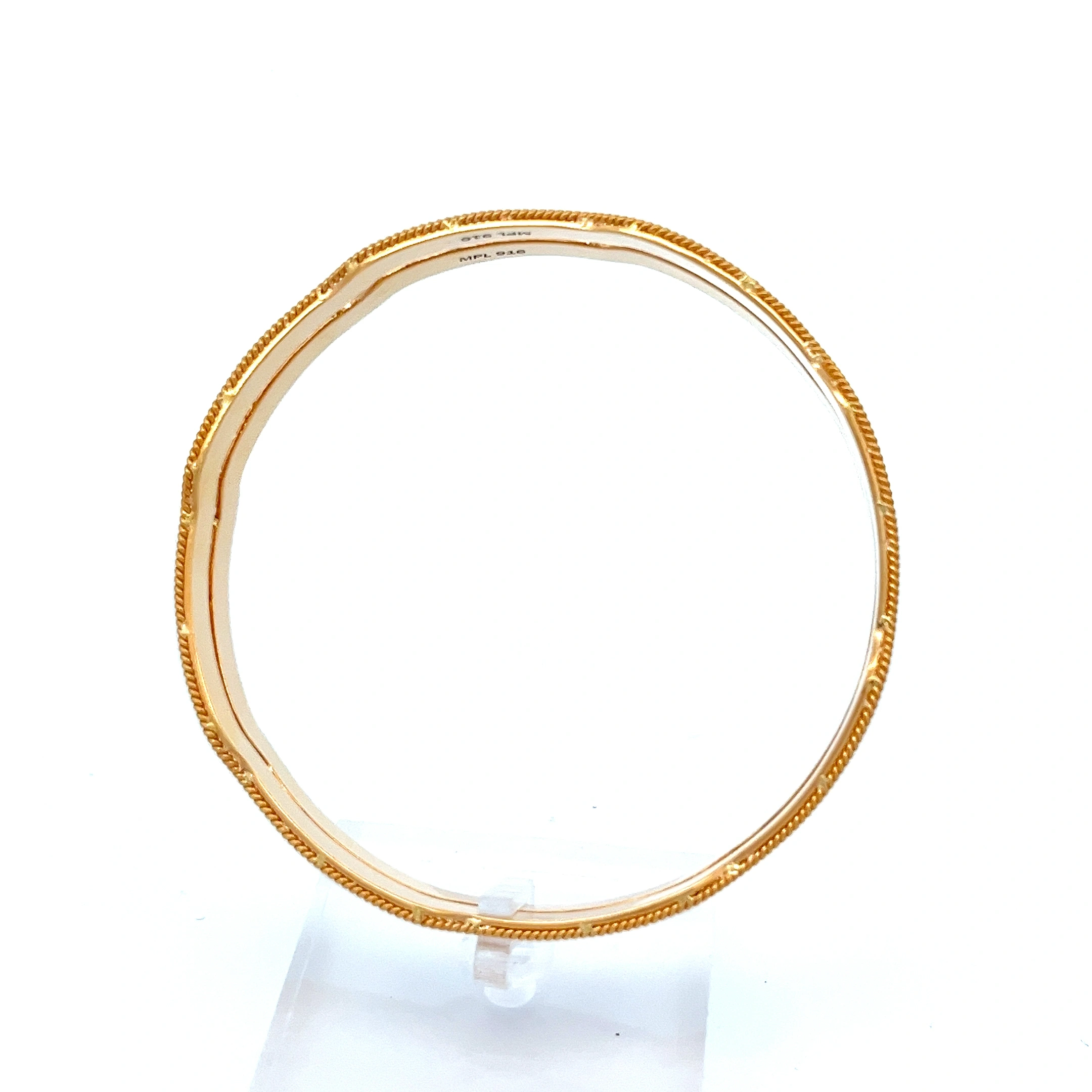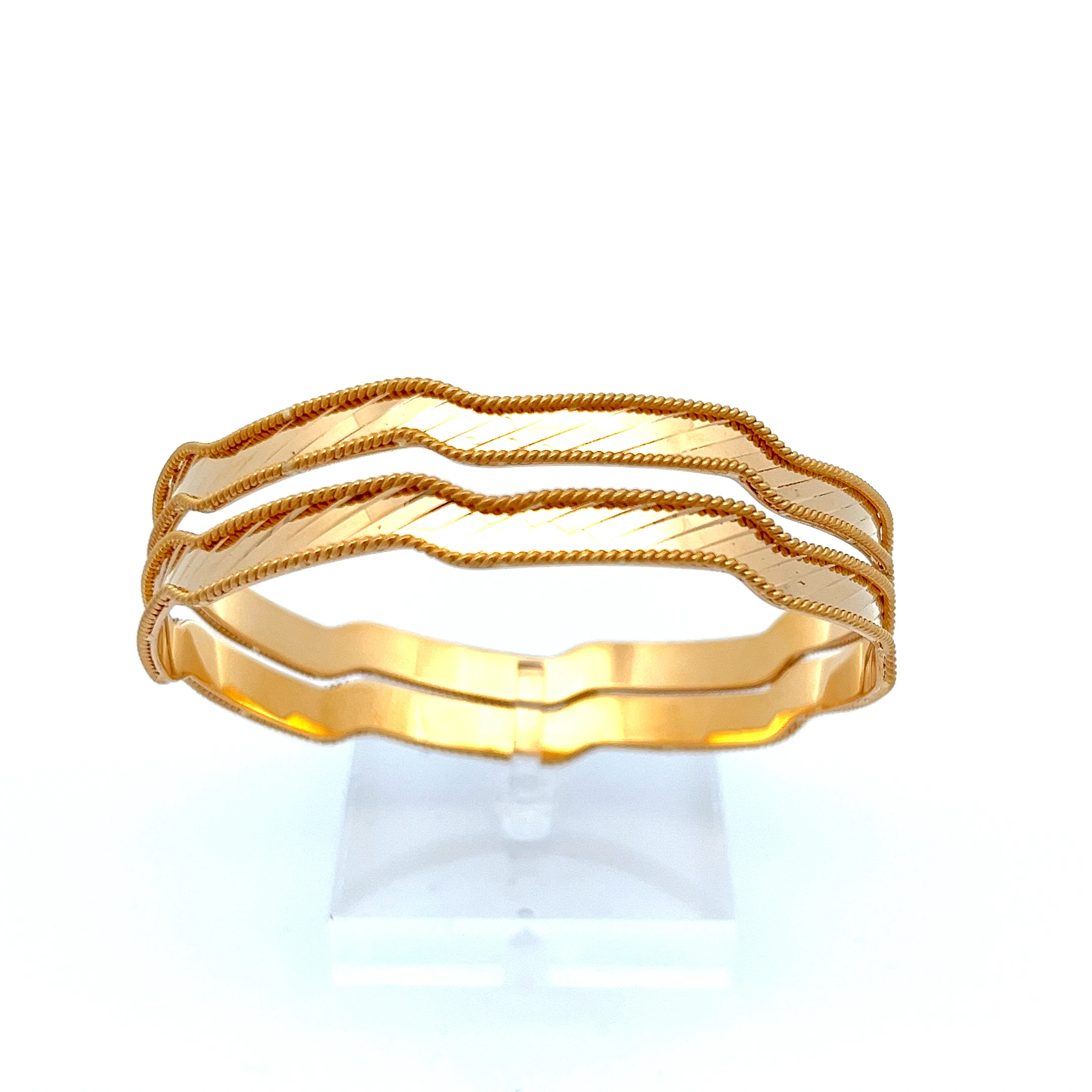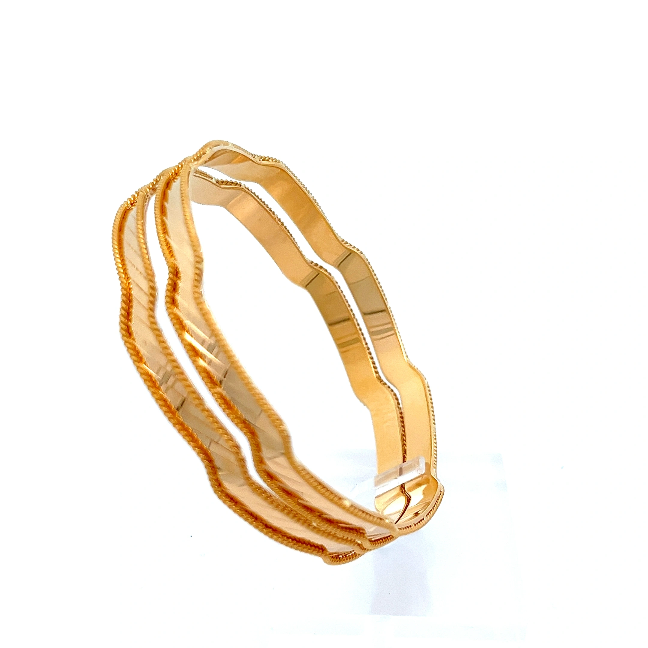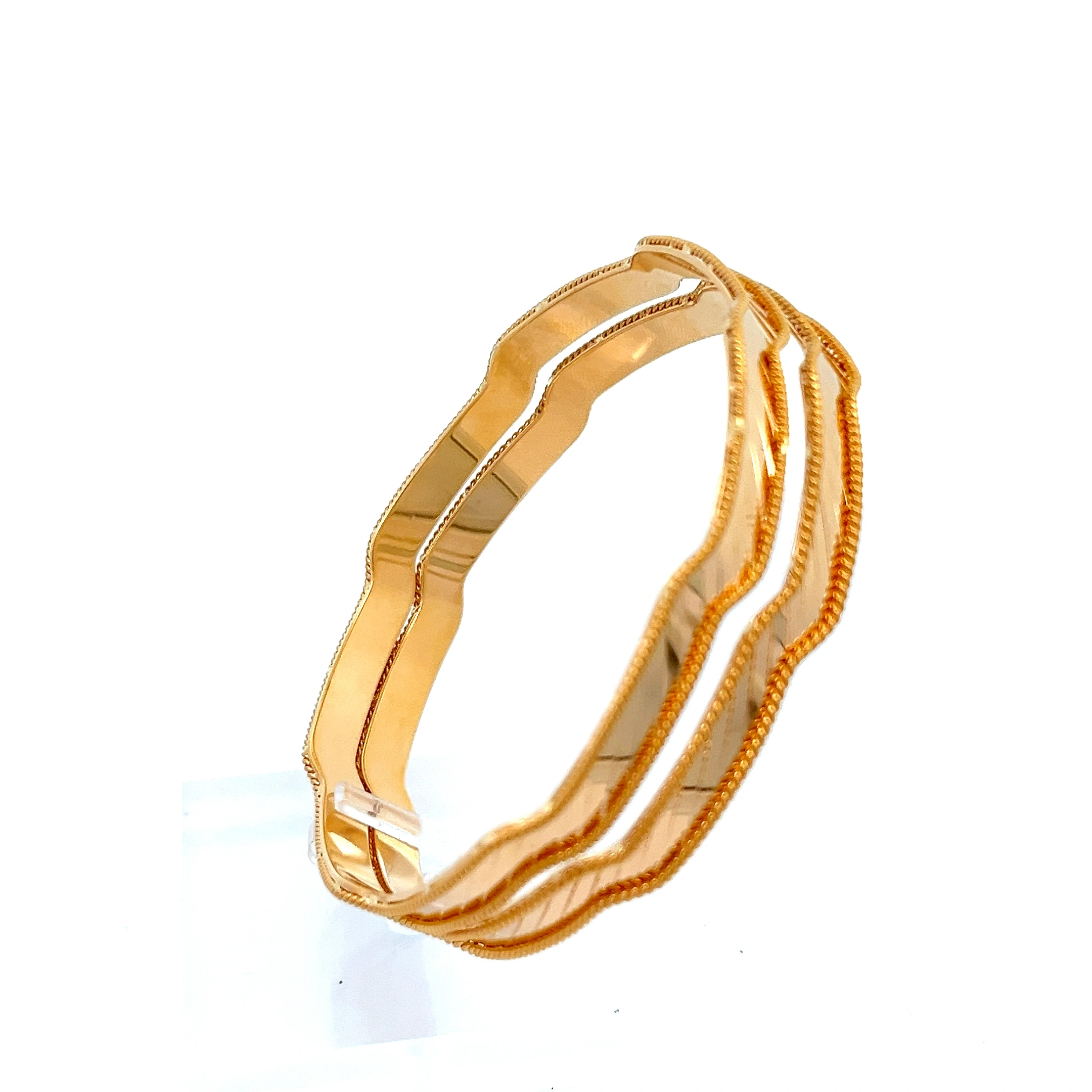 These magnificent Golden Crest Bangle comes in a pair, they are a masterclass in elegant simplicity, featuring a captivating wavy design that gracefully catches the light with every movement. Crafted from pure, polished gold, this set includes three distinct bangles: one with a smooth, undulating surface; a second adorned with a delicate, twisted rope texture; and a third with a gentle, ridged pattern. Worn together, they create a stunning, harmonious ensemble that adds a touch of sophistication to any outfit, from everyday wear to special occasions. Their timeless design ensures they will remain a cherished part of your jewellery collection for years to come.