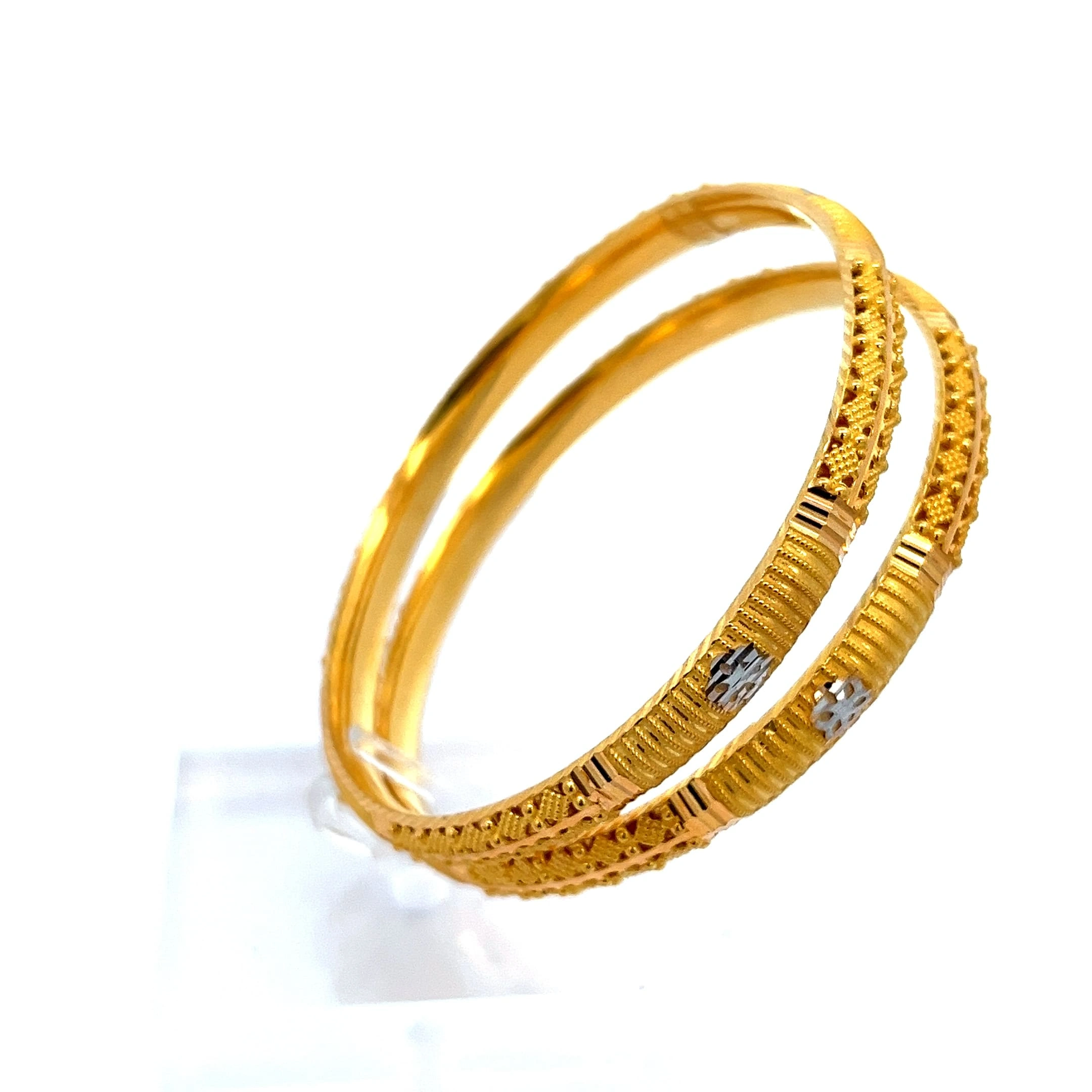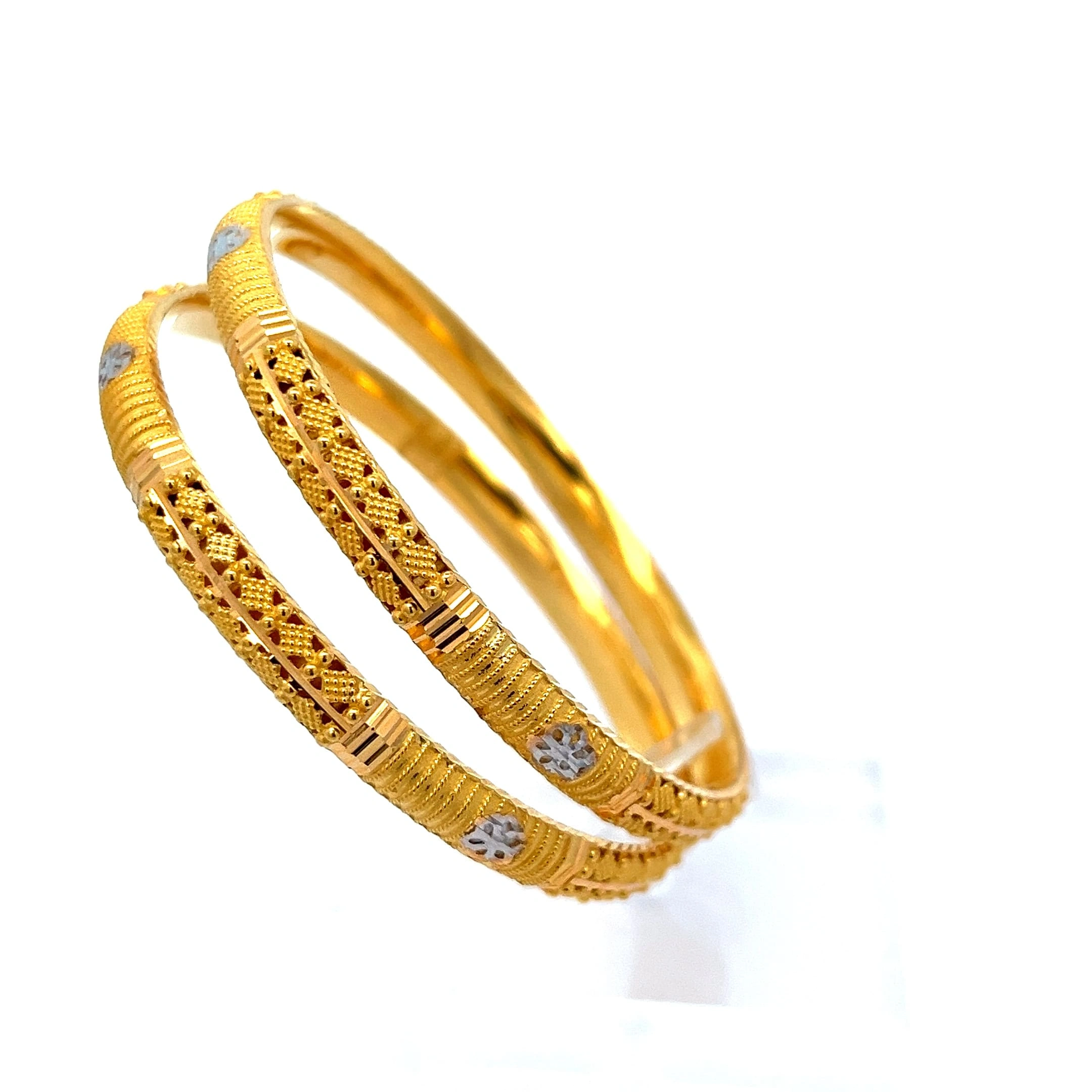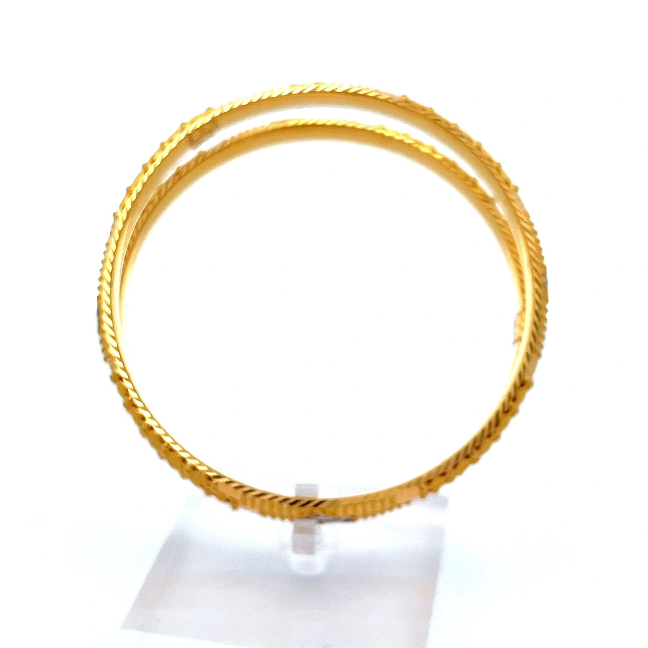Elevate your ensemble with the Majestic Duo Bangle, a stunning 916 gold piece weighing 29.19g. This sophisticated design features a captivating twin-band aesthetic, with one band showcasing a polished, smooth finish and the other delicately studded with brilliant, tiny gold spheres for a hint of sparkle. Crafted for the modern woman, its secure clasp ensures comfortable, all-day wear. The intertwined bands symbolise unity and strength, making it a beautiful, meaningful addition to any jewellery collection. Perfect for both daily elegance and special occasions, it’s a timeless investment you’ll cherish.