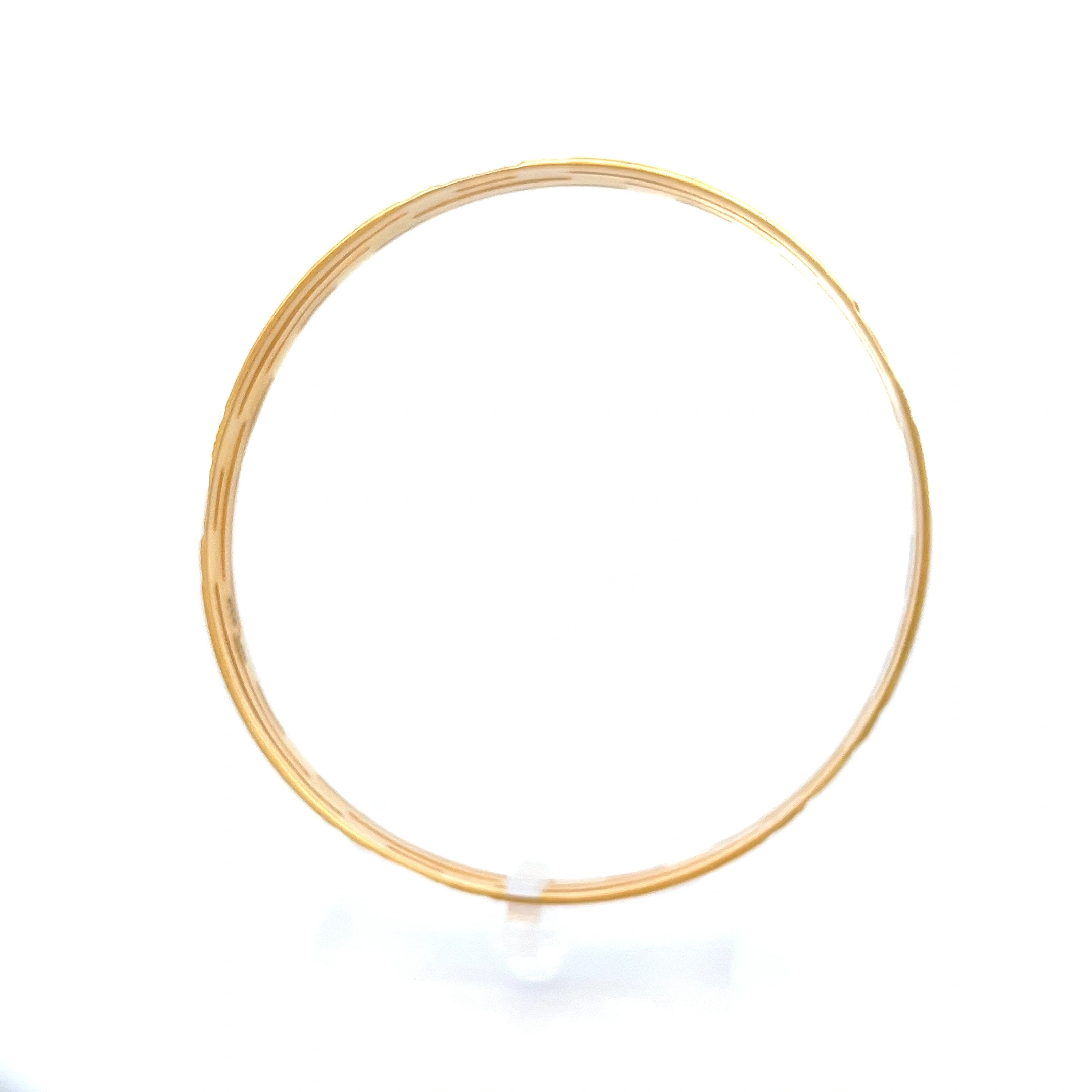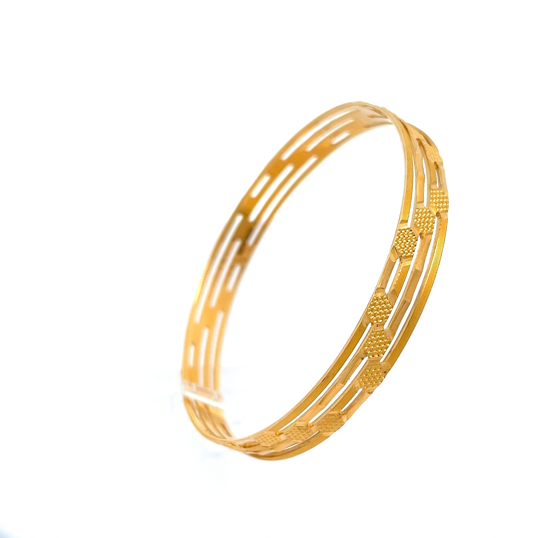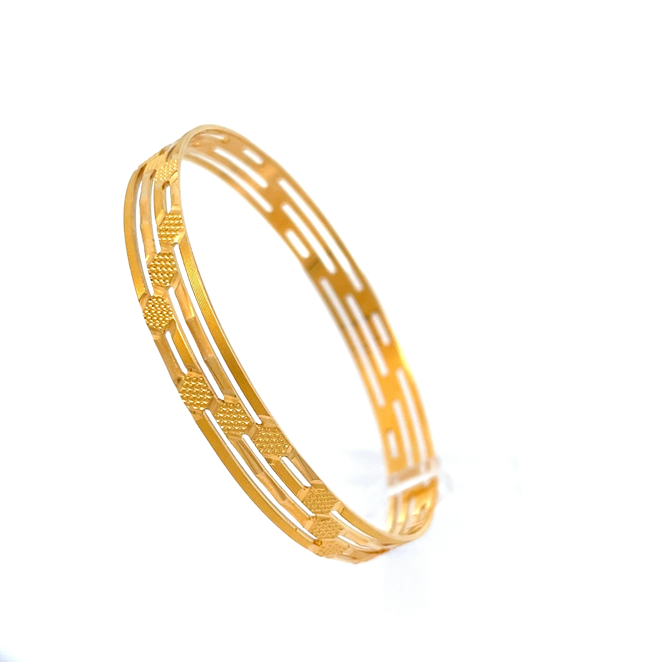 This delicate and modern set of 916 gold bangles offers a fresh take on classic gold jewelry. The set features three individual bangles that are permanently linked together, each with a smooth, polished finish. The design’s focal point is a series of small, beautifully crafted circular motifs clustered together on each bangle, creating a subtle yet eye-catching detail that catches the light with every movement. This elegant trio is perfect for those who appreciate minimalist design with a touch of playful charm and can be worn effortlessly for a refined, everyday look or stacked with other pieces for a more personalised style.