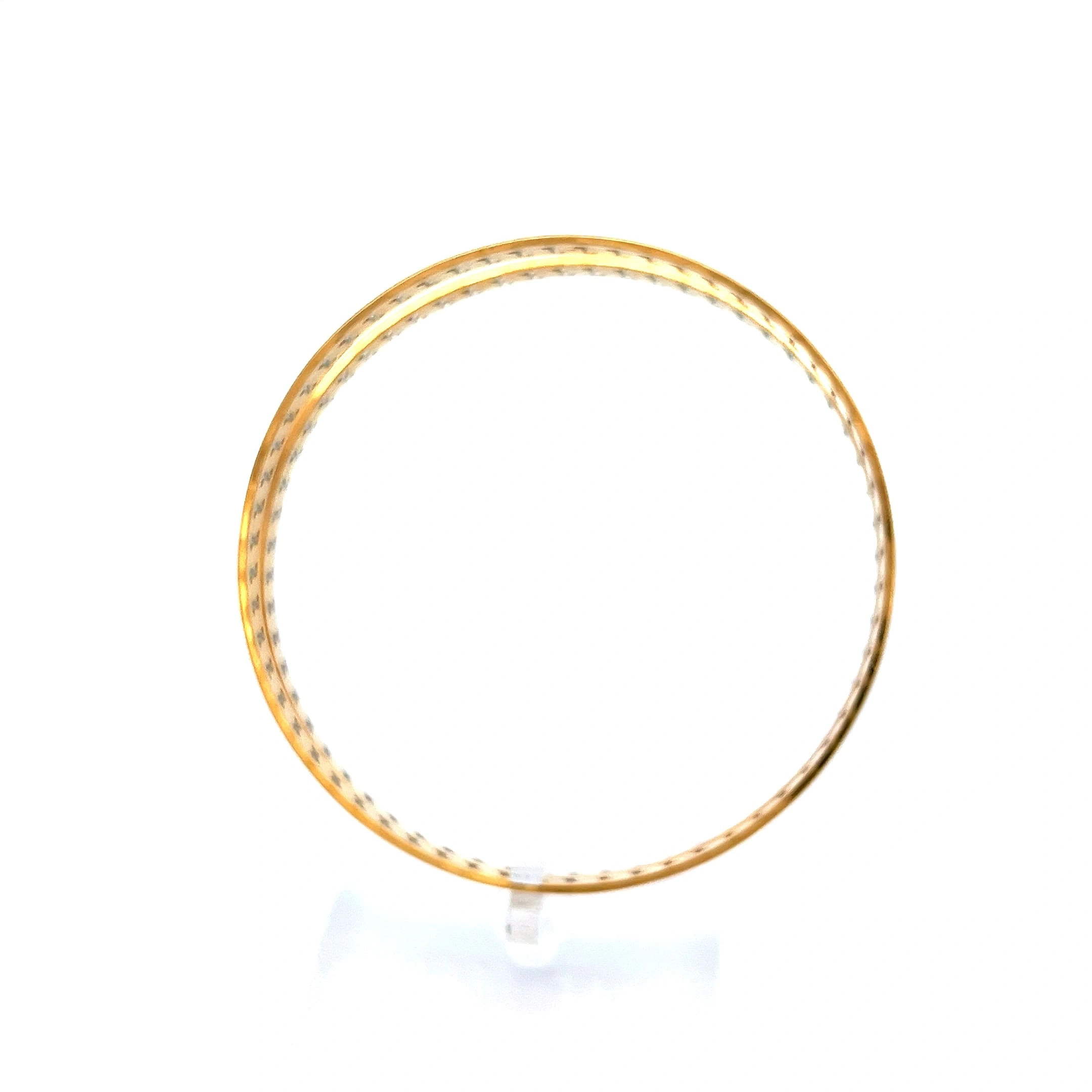 Adorn your wrist with the dazzling Ribbon Sparkle Bangle, a beautifully crafted piece in 916 gold, weighing 24.63g. This exquisite design features two fine, parallel bands, subtly twisted to create a 'ribbon' effect, with the outer edge encrusted with meticulously placed golden accents. The slight curve and reflective surfaces capture the light beautifully, offering a sophisticated and brilliant shimmer. This elegant bangle is perfect for formal occasions or as a radiant finishing touch to an everyday luxury look.