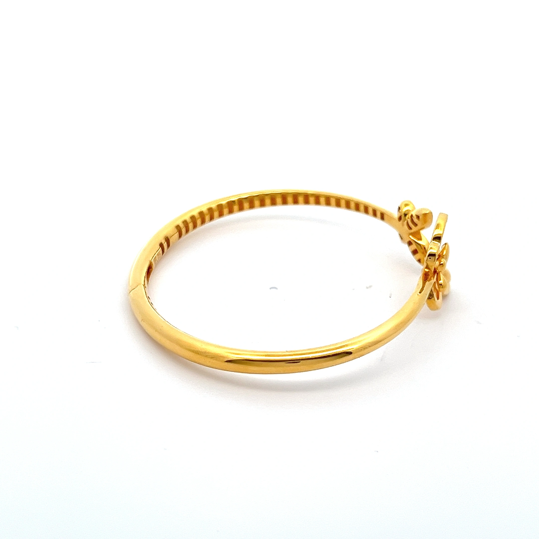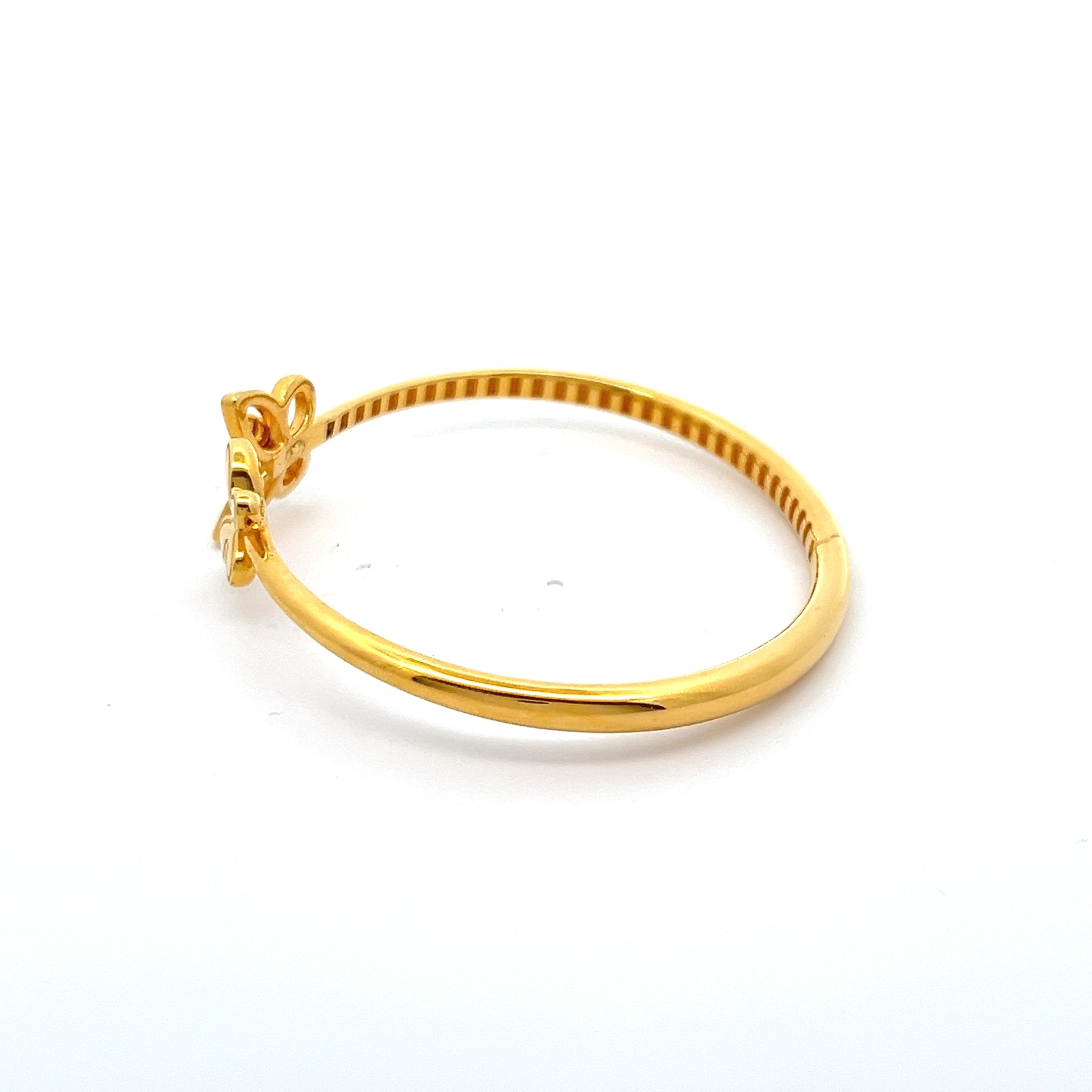 This charming 916 gold open-ended bangle features a delightful and symmetrical design. The smooth, polished band is adorned with two identical butterfly motifs at each end, creating a harmonious and elegant look. The butterflies are intricately crafted with delicate, open-work detailing, giving them a light and airy feel. This bangle is a perfect blend of whimsy and sophistication, ideal for adding a touch of playful elegance to any outfit. The open design allows for easy wear and comfortable movement. Crafted from high-quality 916 gold, this piece is both beautiful and built to last, making it a treasured addition to any collection.