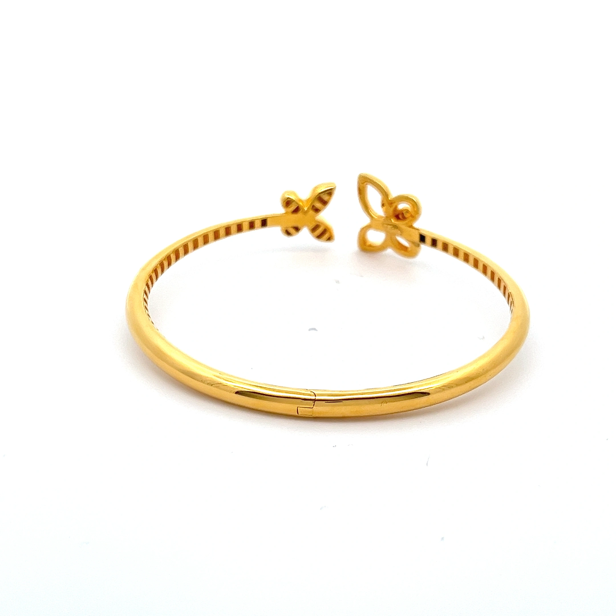A charming 916 gold open-ended bangle featuring a pair of intricately crafted butterfly motifs at each end. This symmetrical design offers a delicate and playful elegance, perfect for adding a touch of natural beauty to your style. It is both lightweight and comfortable.