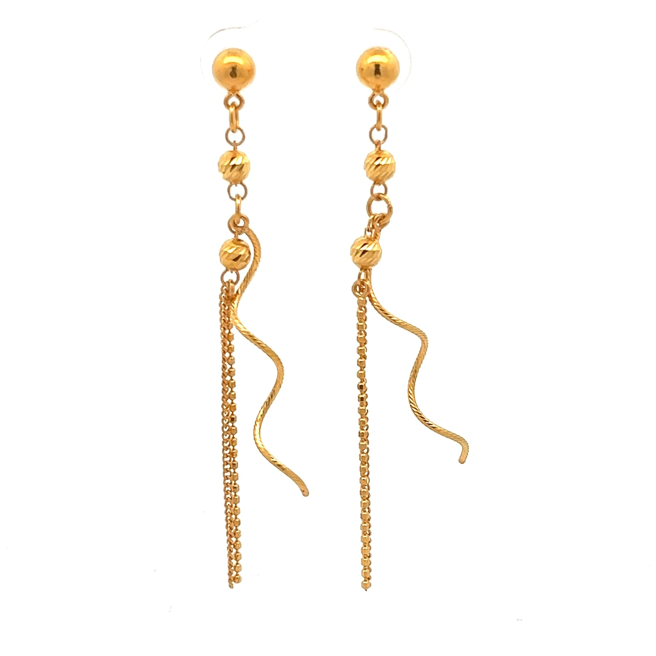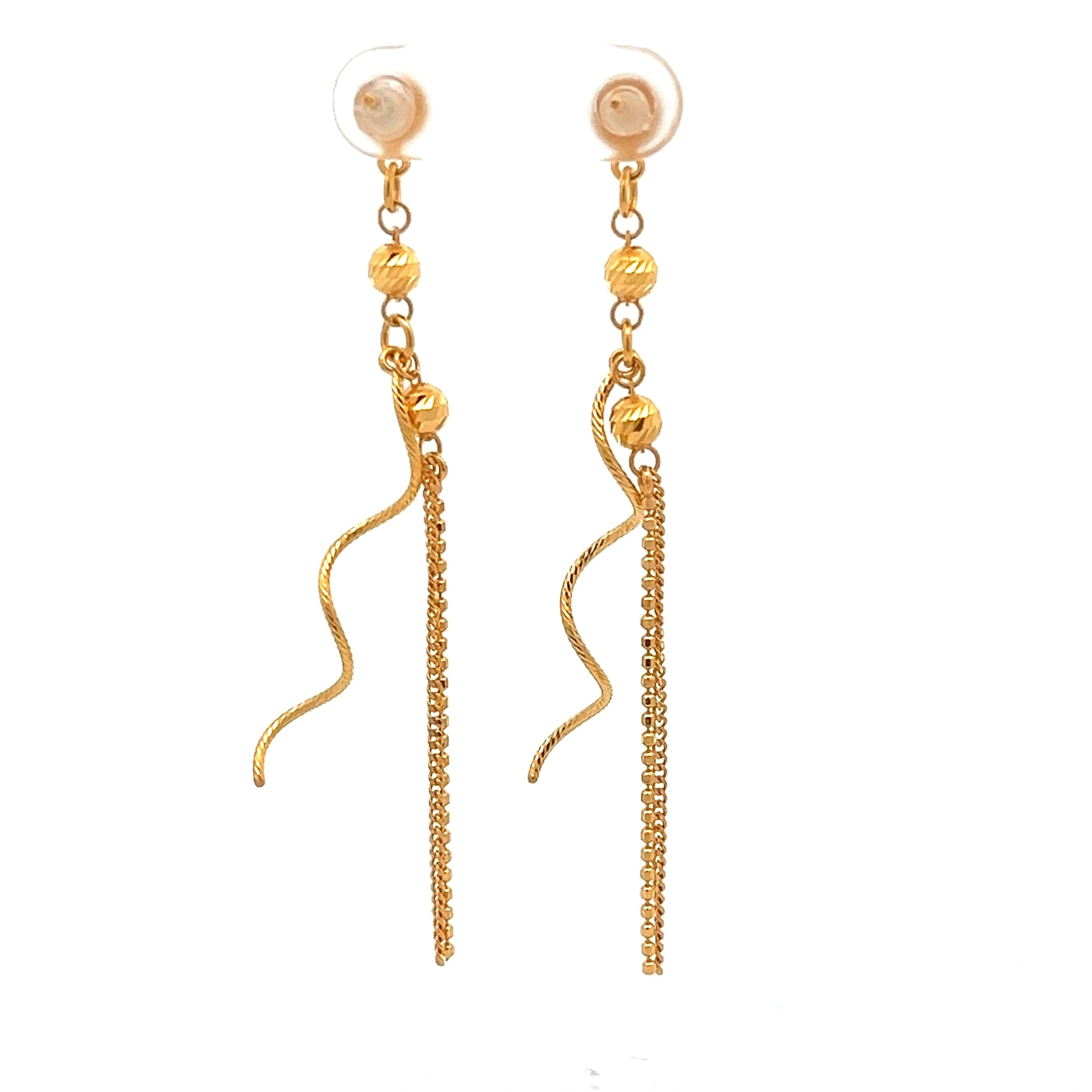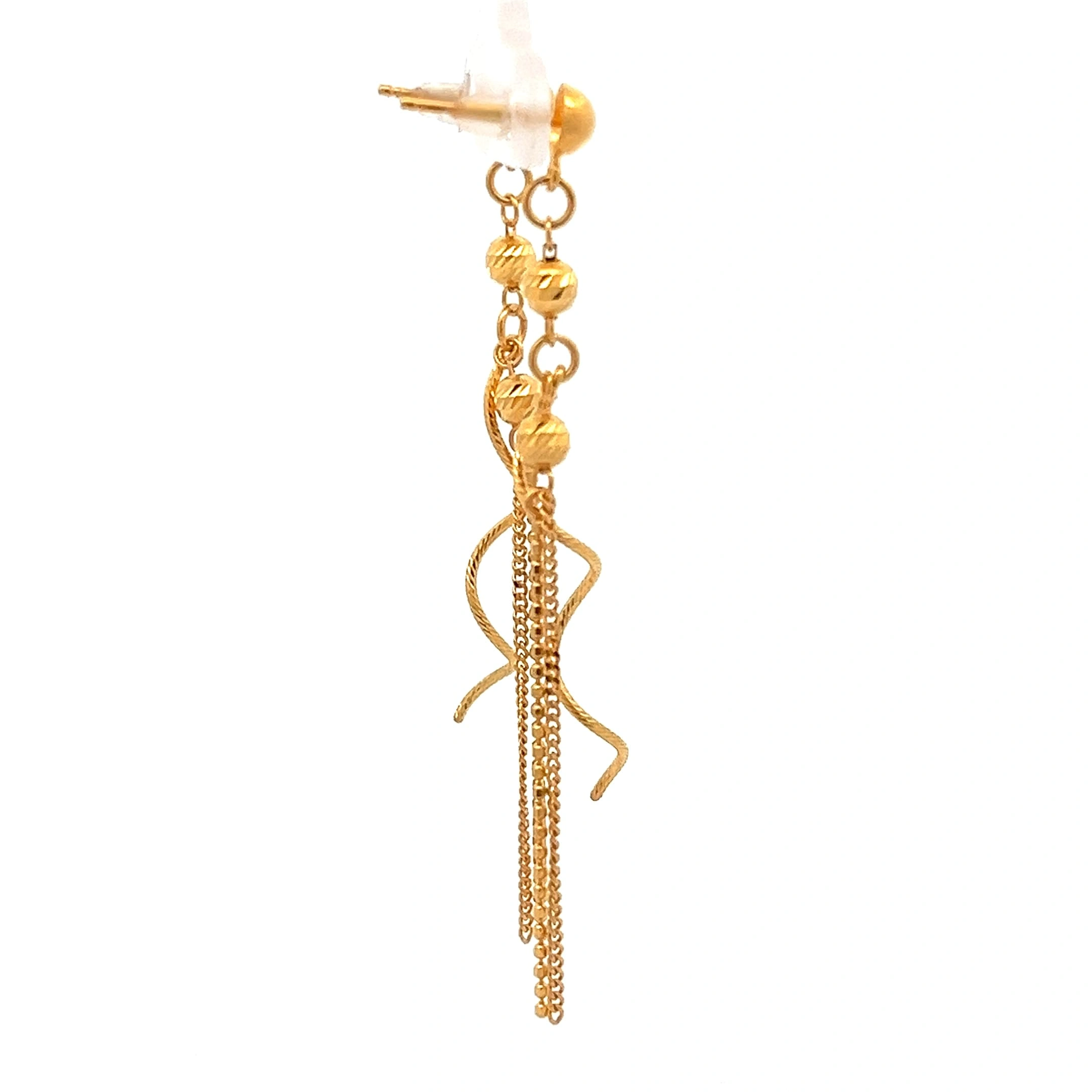 Elegant gold earrings featuring a slender bar with a cascade of delicate, shimmering gold chains. Meticulously designed in 916 gold for a sophisticated look.
