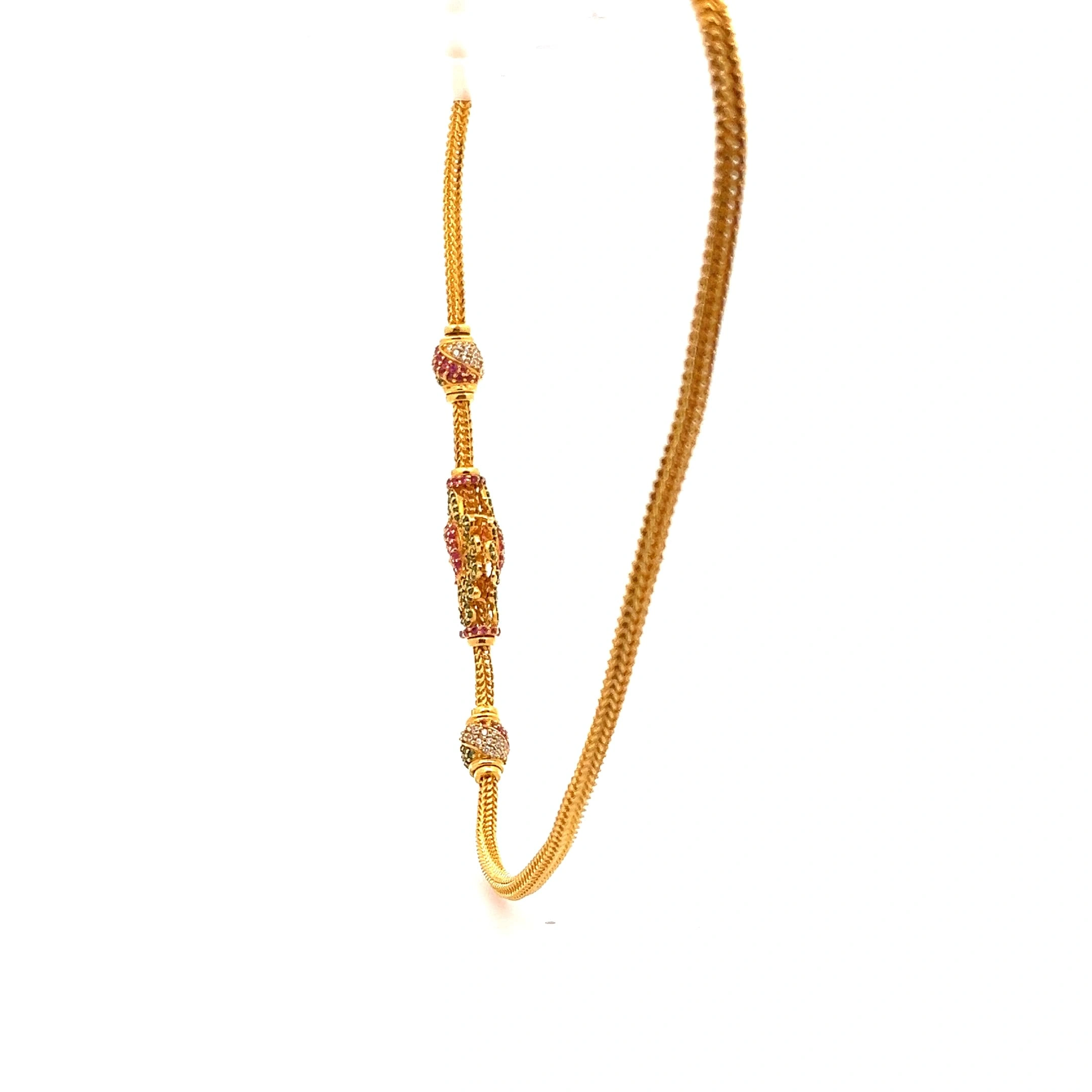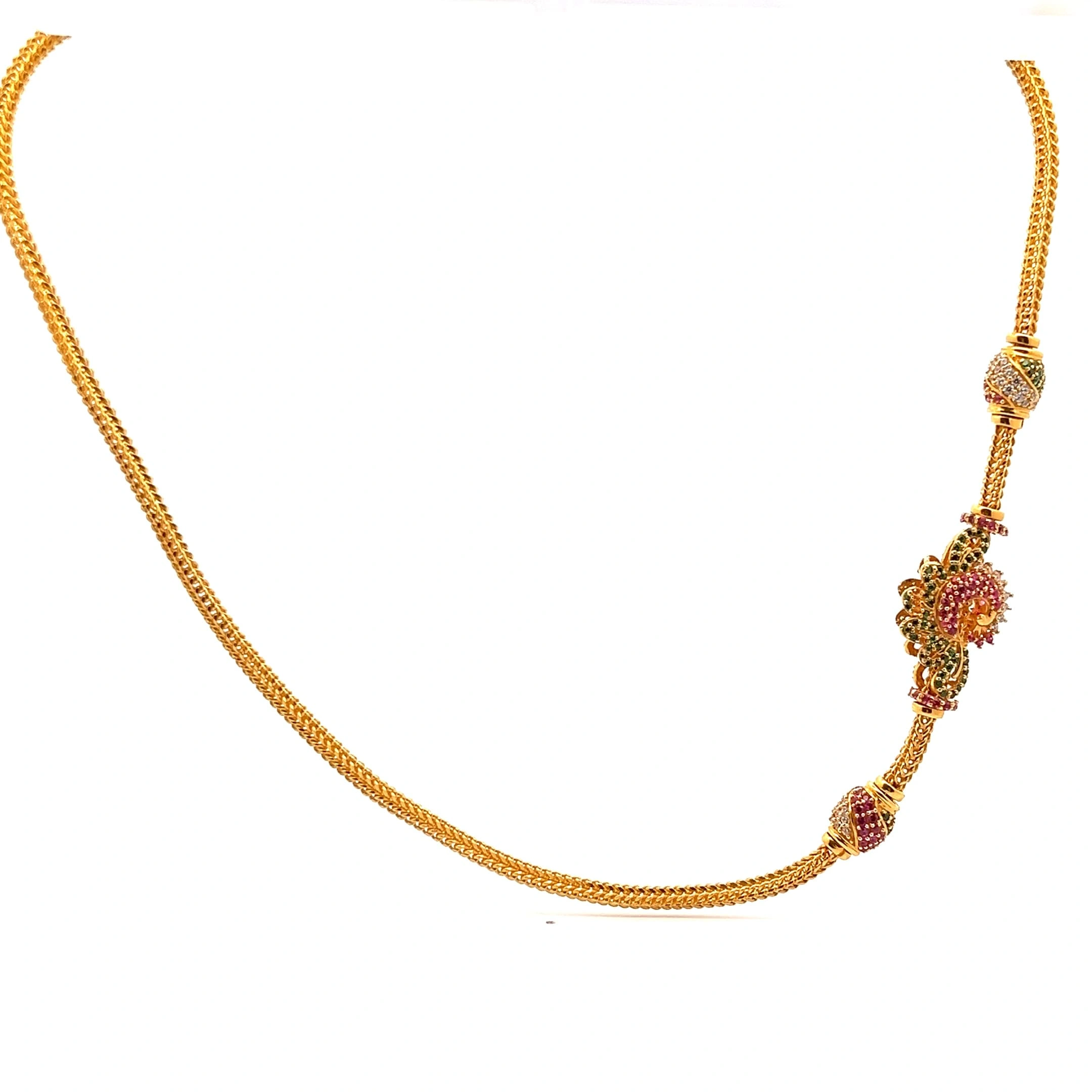 Command attention with the magnificent Amara Mugappu Necklace, an exquisite example of high-carat, traditional 916 hallmarked gold jewellery. This piece is a substantial investment, weighing 56.12g, and features a robust, elaborate gold chain. The centrepiece is a remarkably large and intricately designed Mugappu motif, positioned prominently to serve as an opulent and traditional side-clasp accent. This necklace embodies grand South Asian jewellery traditions and is perfectly suited for weddings, festivals, or as a timeless, luxurious family heirloom that showcases the highest level of gold artistry.