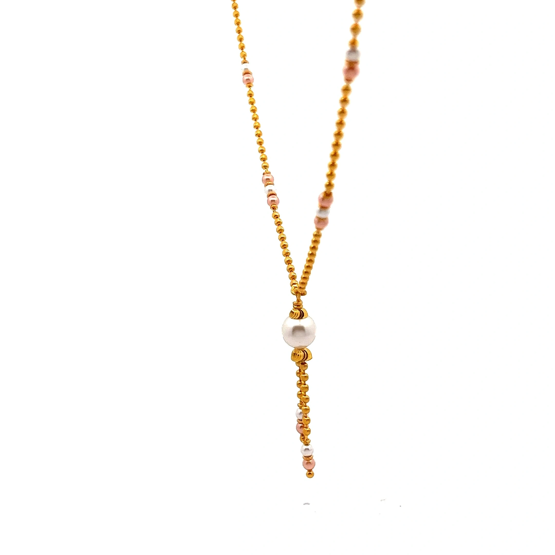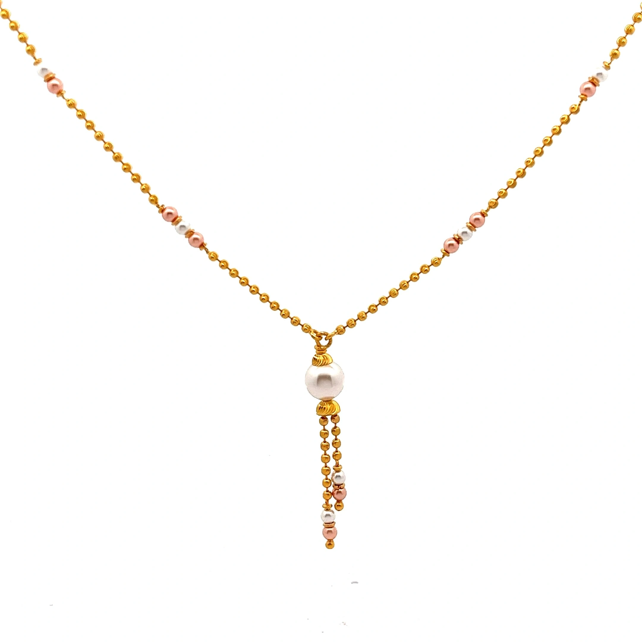 This modern Y-style 916 gold lariat necklace features a fine chain that drops into a fluid tassel of delicate, textured gold elements. An elegant, adjustable piece for a fashionable look.
