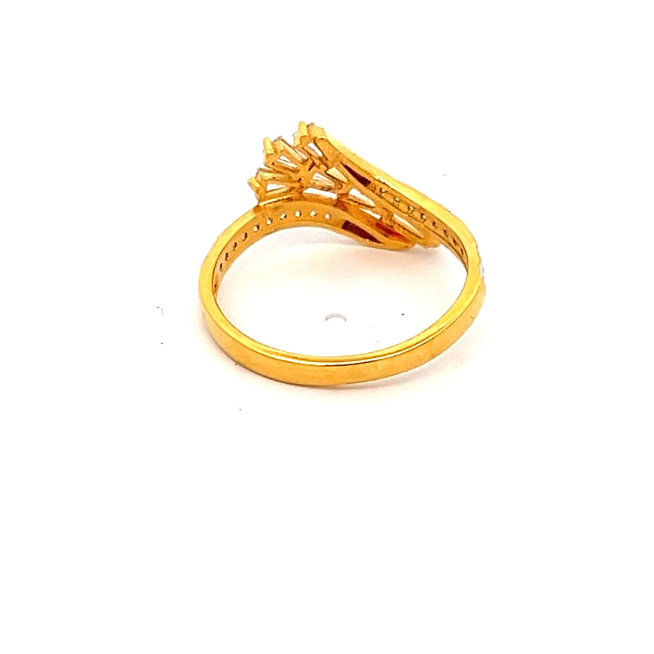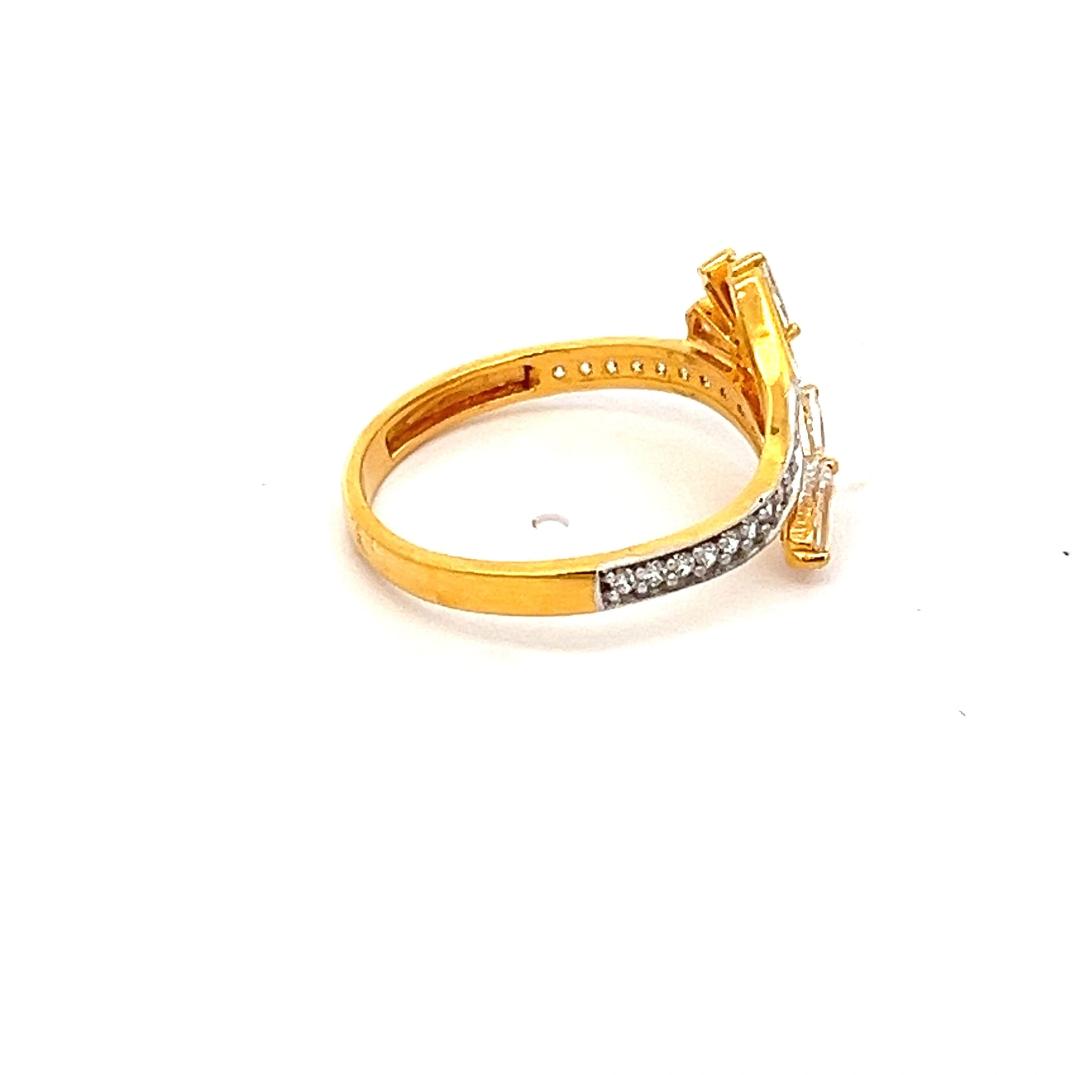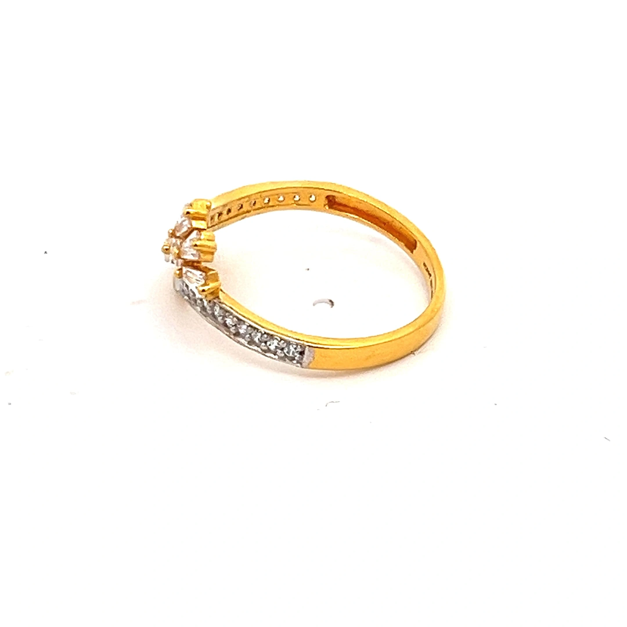 The sophisticated Crest Ring offers a blend of classic elegance and modern flair. This 916 gold ring features a wide, polished band that sweeps up to form a striking, central V-shape or crest. The shoulders of the ring are beautifully enhanced with parallel rows of micro-set brilliant stones, adding a linear sparkle that contrasts brilliantly with the smooth gold. Weighing 2.76 grams, it sits comfortably on the finger while providing a noticeable presence. This versatile design is perfect for both everyday luxury and formal occasions, offering a refined, polished finish that speaks of understated quality and contemporary grace.