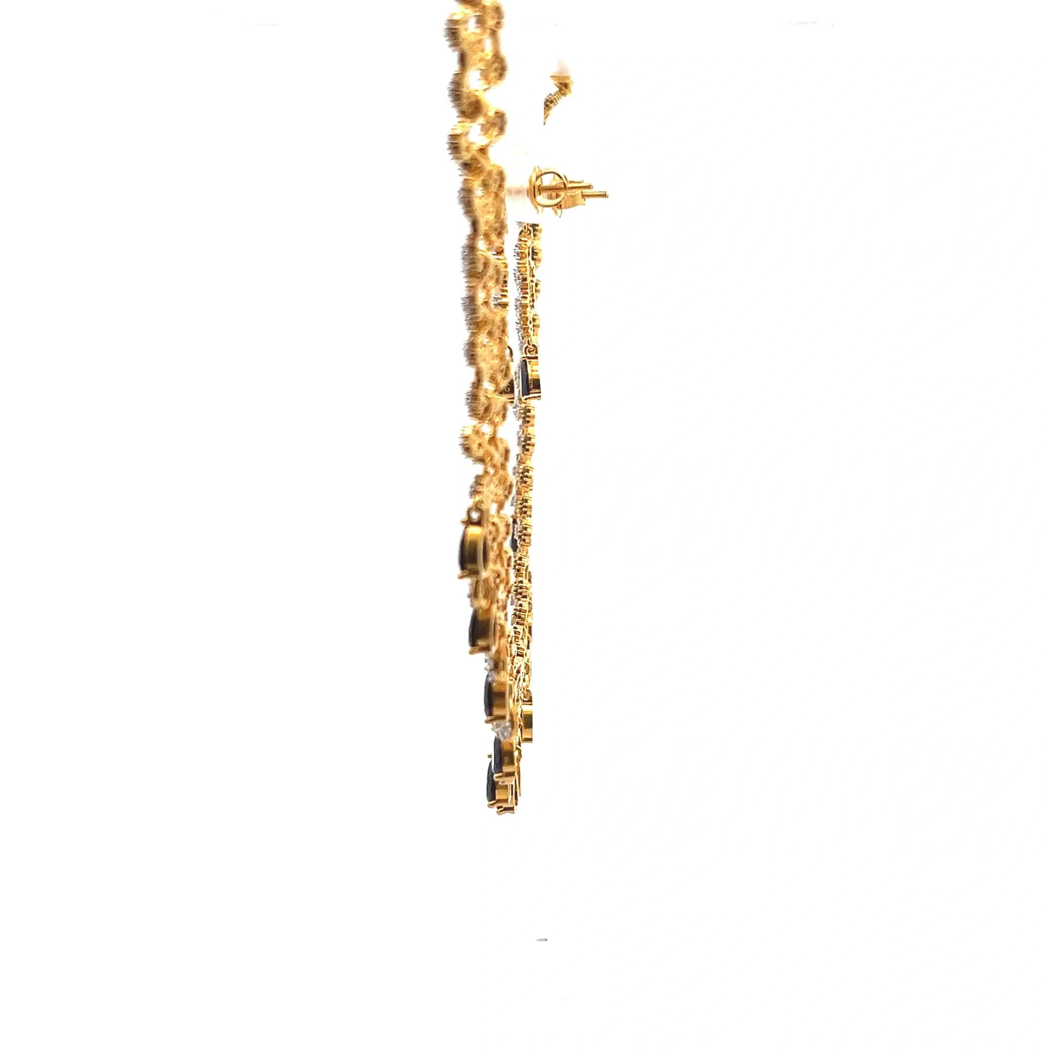 Experience the rich legacy of classic Indian jewellery with the Maharani Radiance Necklace set. Crafted meticulously in radiant 22-karat yellow gold, this piece showcases a stunning bib design adorned with intricate filigree and delicate green meena work or stones. The necklace features multi-strand detailing and is beautifully embellished with clusters of pristine white seed pearls, offering a soft, traditional contrast to the gold. The accompanying teardrop earrings perfectly mirror the pendant’s design, making this set a timeless choice for significant occasions like weddings and grand festivals where a regal, vintage look is desired.