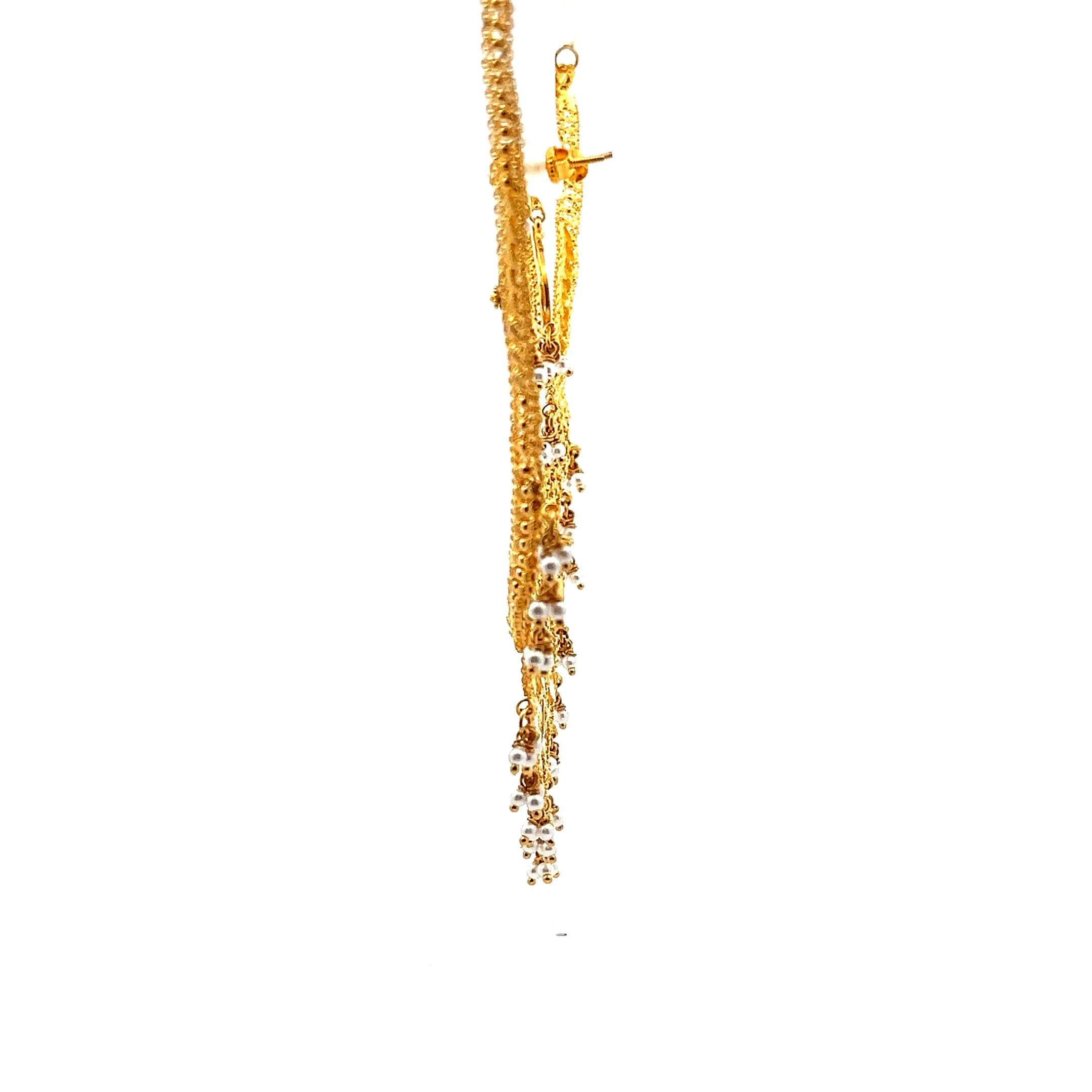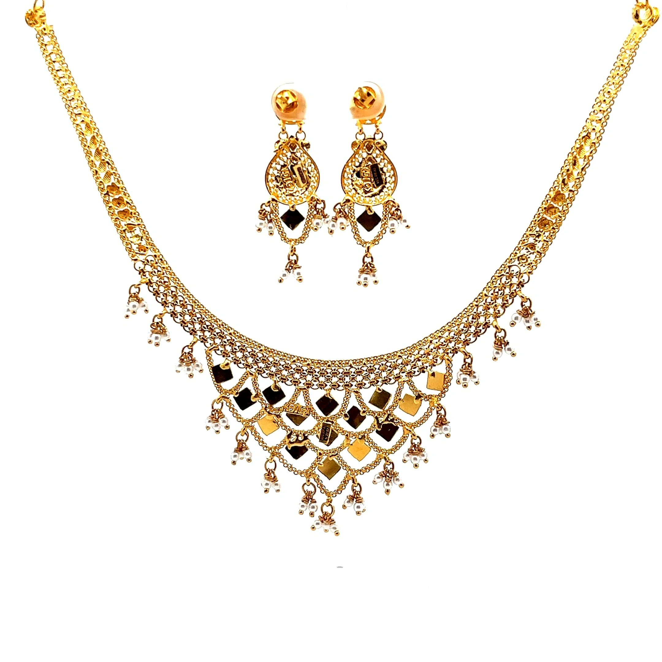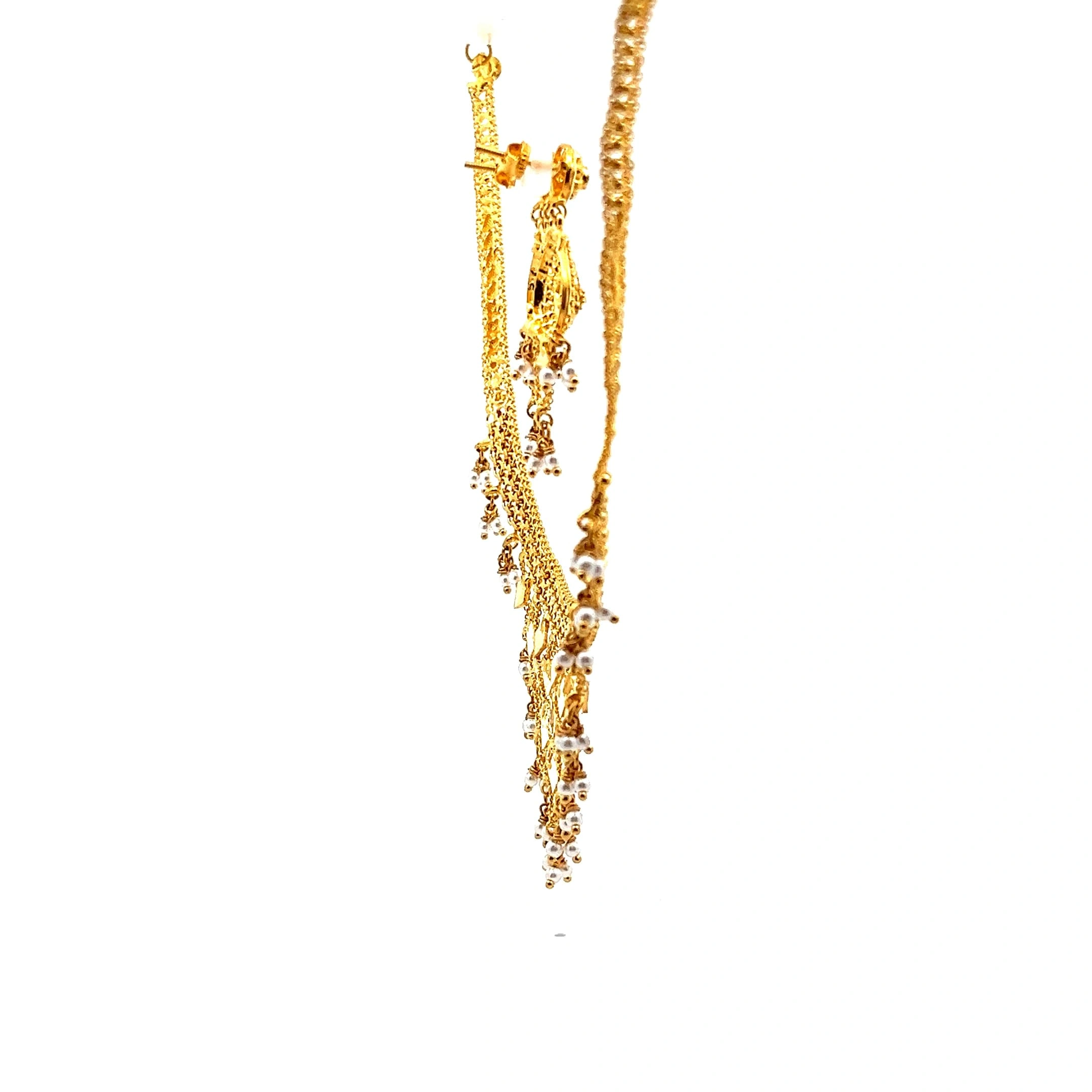 The Vanguard Prism Necklace set offers a sophisticated blend of contemporary design and classic glamour. Expertly fashioned from 22-karat yellow gold, the design features a sequence of striking geometric, fan-shaped links, creating an elegant ‘V’ silhouette. Each unit is meticulously accented with sparkling white and contrasting dark stones, providing exceptional brilliance and depth. The central drop motif adds a beautiful focal point, while the matching drop earrings complete the look. This versatile set is ideal for evening wear, formal dinners, or modern bridal parties, providing a sleek, polished, and unforgettable appearance.