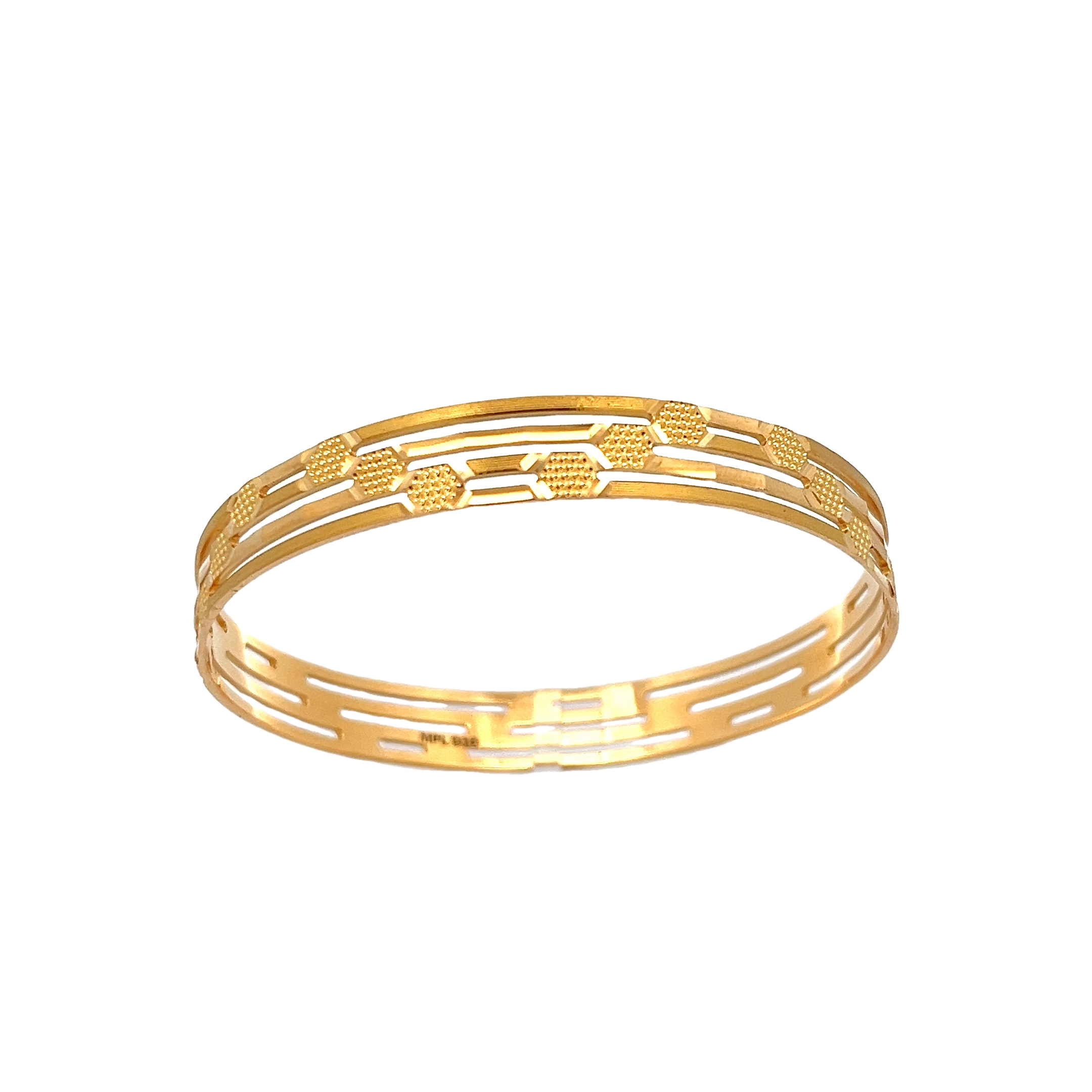 Celebrating the brilliance of tradition and modern sophistication, the Heritage Radiance Bangle is an exquisite piece designed to capture attention. Handcrafted in 22K gold, this bangle features a striking blend of diamond-cut textures and delicate rose gold accents, reflecting light with every movement. The intricate lattice detailing symbolises strength and resilience, making it a perfect tribute to heritage and timeless beauty. Whether worn for festive occasions or as an everyday statement of elegance, this bangle embodies the radiance of cherished family traditions and the modern woman’s grace.