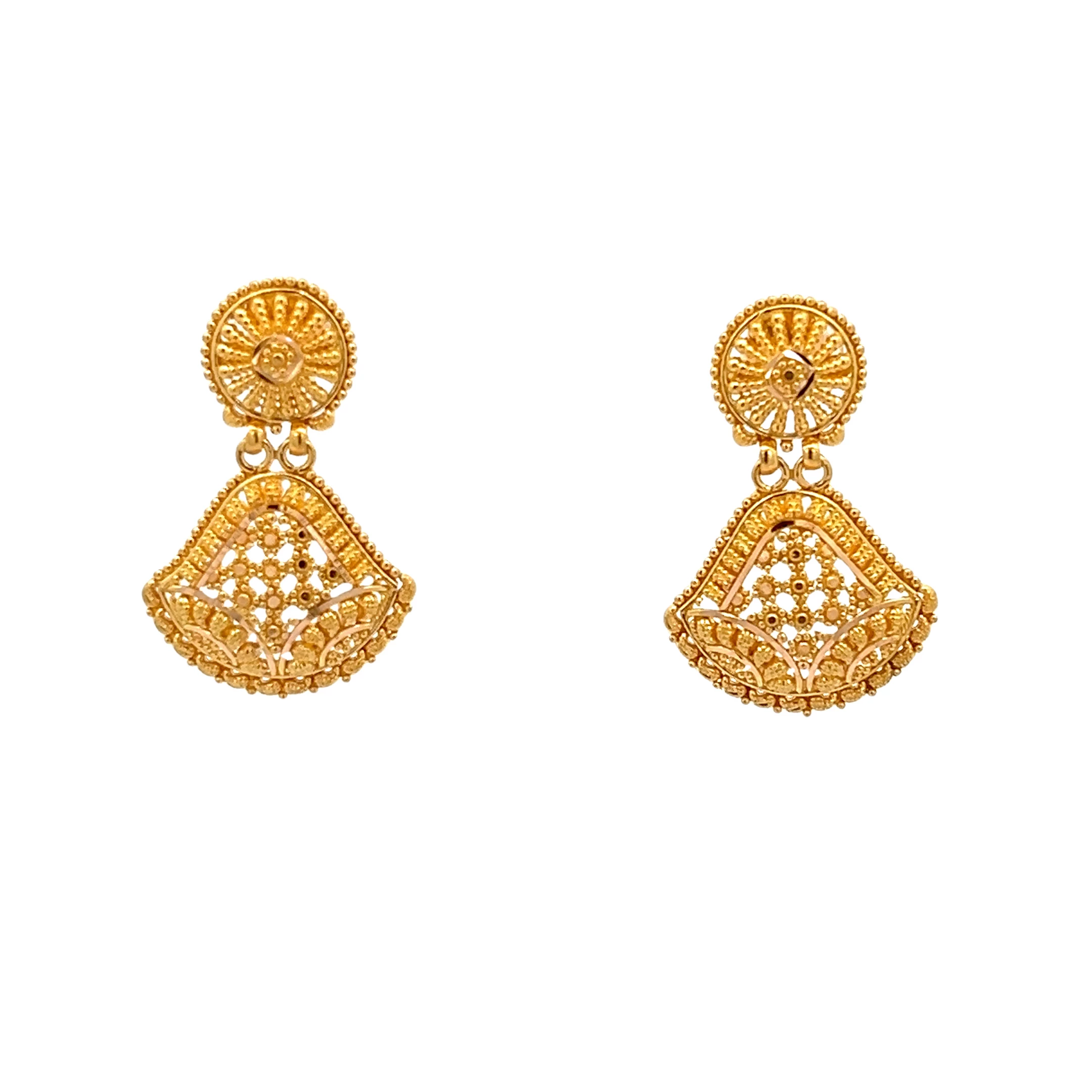Magnificent 22k gold drop earrings weighing 90.48g, crafted with intricate artistry and a bold design for grand occasions.