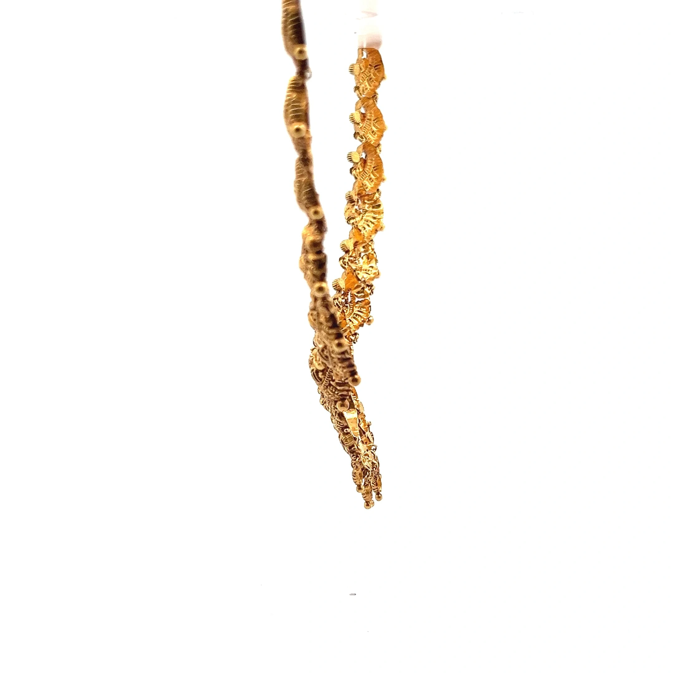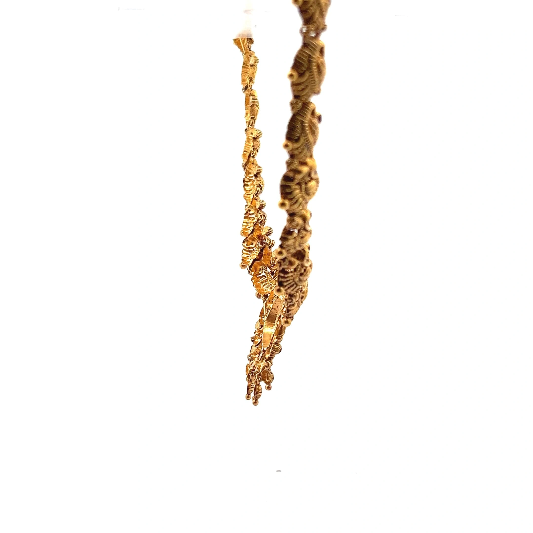 Adorn yourself in the magnificence of the Seraphina Choker Necklace, a breathtaking traditional piece created in substantial 916 hallmarked gold. This wide, choker-style necklace is a masterpiece of South Asian artistry, showcasing highly intricate, ornate detailing and central traditional figural motifs that exude regal elegance. Weighing 23.09g, it sits beautifully and confidently on the neck. This piece is specifically designed for grand traditional events and ceremonies, serving as a powerful, cultural statement that honours classic British English wedding and festive jewellery traditions.