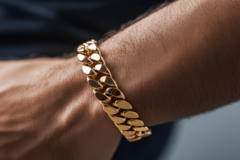 A Cuban link bracelet is known for its sturdy and bold design. The tightly interlocking links create a masculine and eye-catching piece. The Cuban link bracelet is a statement accessory that exudes confidence and style.