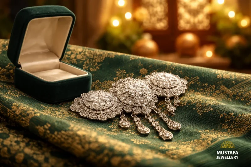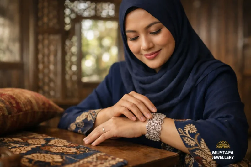Set kerongsang perak sterling yang berkualiti biasanya berharga antara RM200 hingga RM800, bergantung pada kerumitan hasil kerja filigree dan sebarang aksen batu permata. Bagi pemakai hijab, kerongsang tunggal menawarkan keanggunan yang serupa serta fleksibiliti yang lebih tinggi. Carilah kerongsang dengan mekanisme pin yang selamat kerana tiada apa yang merosakkan gambar hari raya lebih cepat daripada kerongsang yang terus tergelincir.