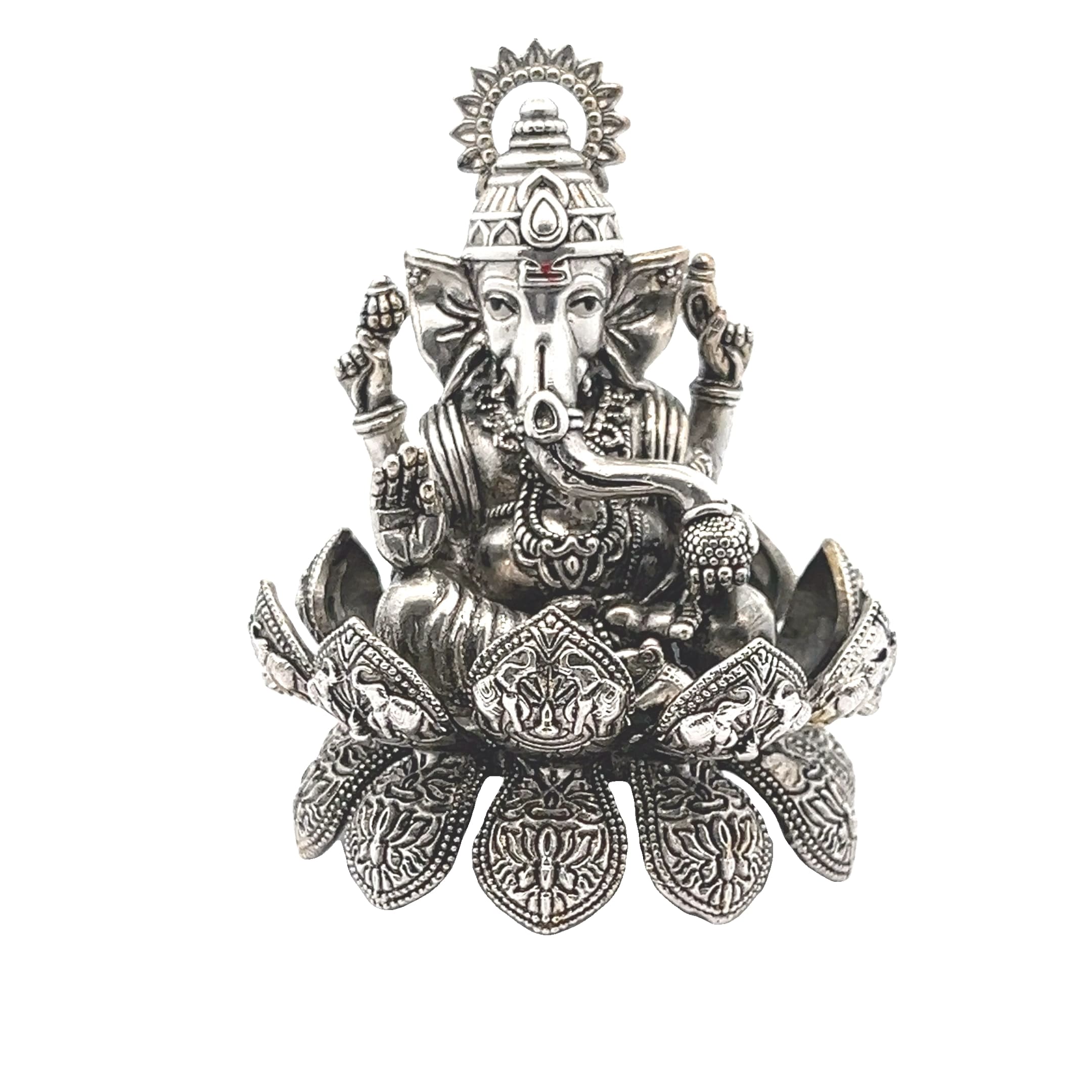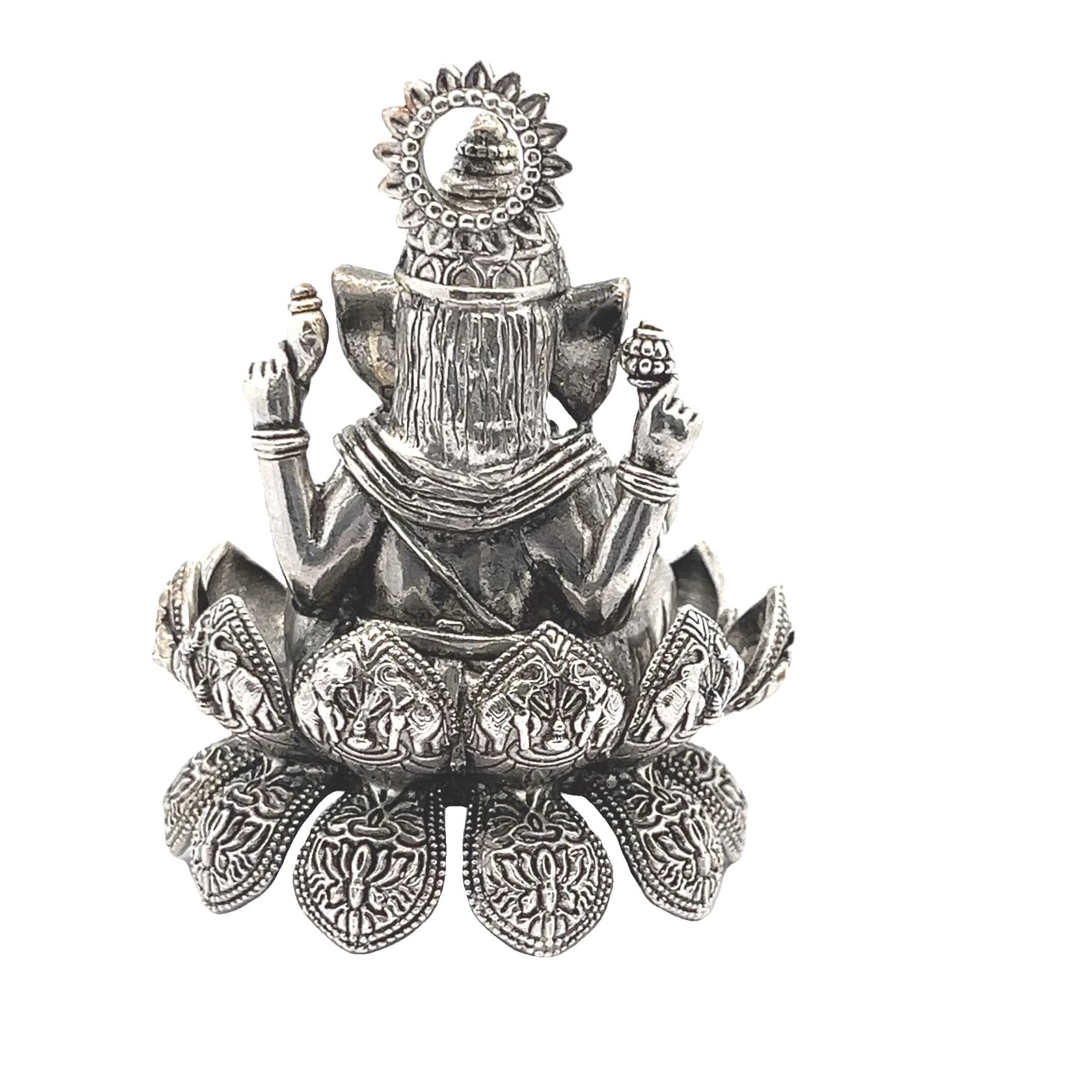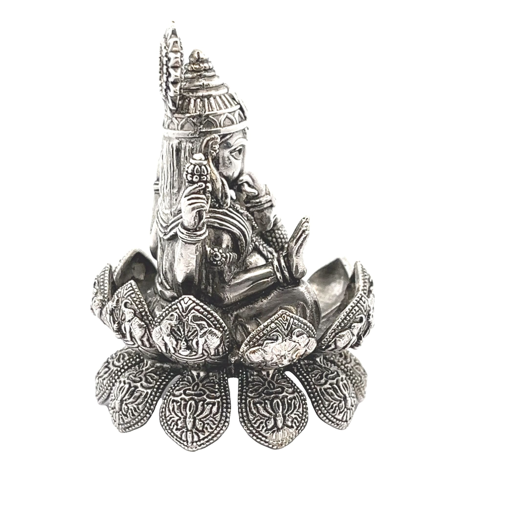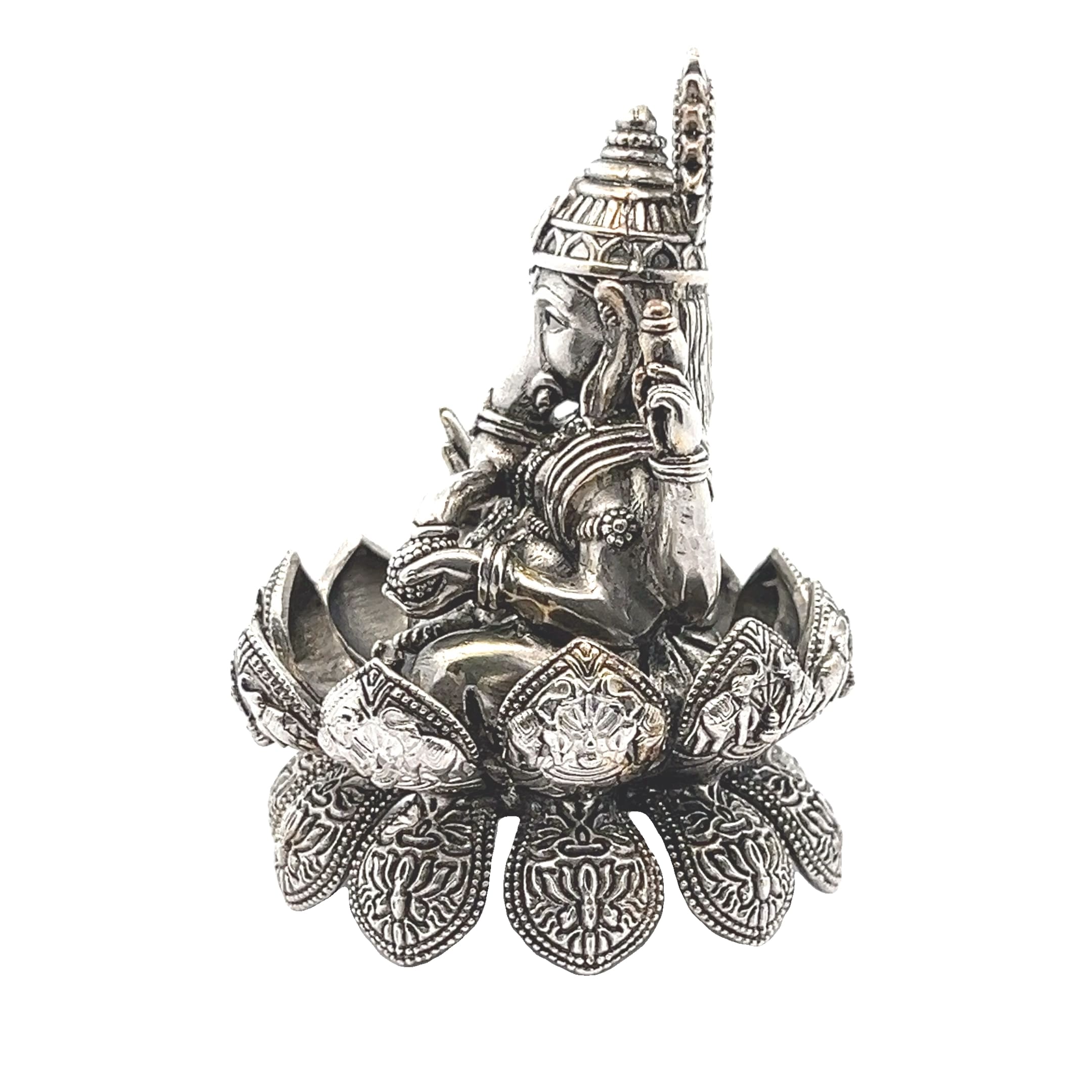 A beautifully detailed silver idol of Lord Ganesha seated on a lotus, symbolising wisdom, blessings, and new beginnings.