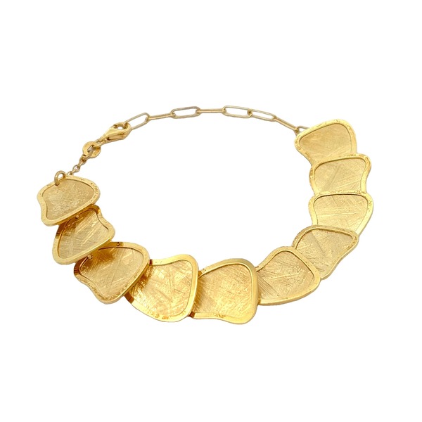 Channel the warmth and brilliance of the cosmos with the Solar Fragment Bracelet. Crafted from sterling silver and plated in lustrous gold, this piece features abstract, irregular links that echo the raw beauty of sunlit shards. Its radiant finish and sculptural form make it a statement of natural elegance, perfect for days when you want to glow with quiet confidence or nights when you shine with bold brilliance.