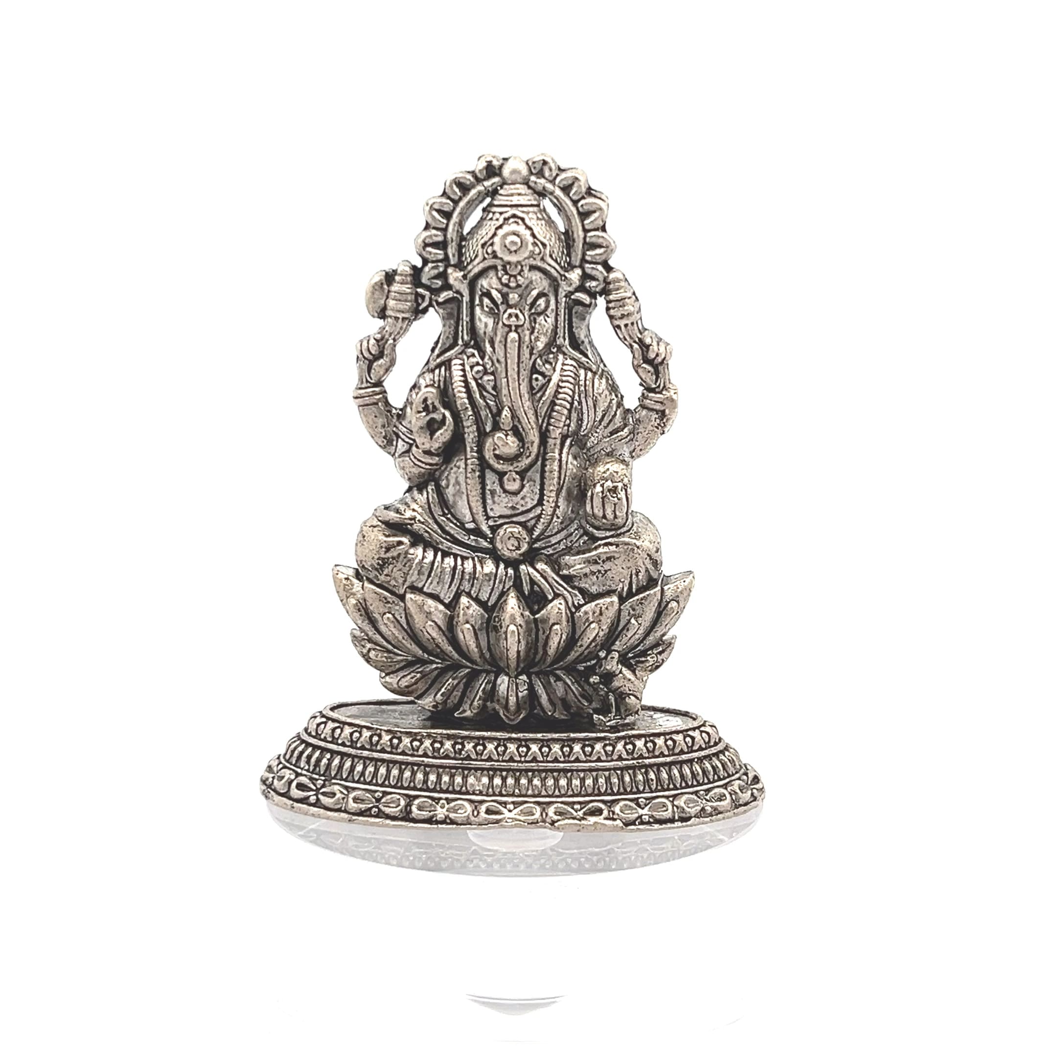 An intricately designed oxidised silver Ganesha idol seated on a lotus pedestal, symbolising wisdom, success, and new beginnings.