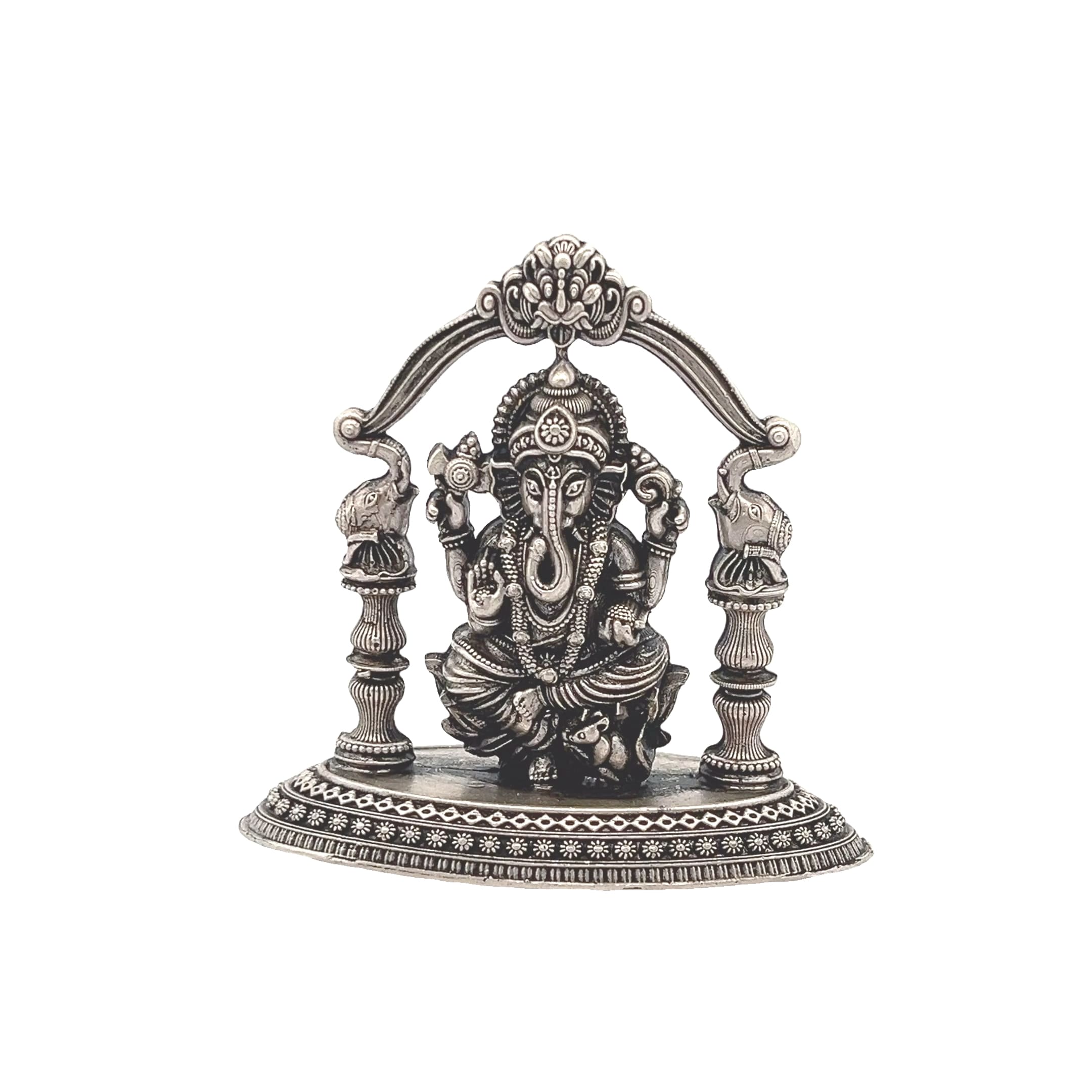 Bring home divine blessings with Elephant Grace Ganesha Idol, a masterfully detailed silver-toned idol showcasing Lord Ganesha seated serenely beneath an ornate arch. Supported by two majestic elephant-shaped pillars, this piece reflects wisdom, strength, and auspicious beginnings. Whether placed in your puja room or gifted to a loved one, it’s a symbol of spiritual protection and prosperity. The artisan craftsmanship and symbolic elements make it a timeless addition to any sacred space.