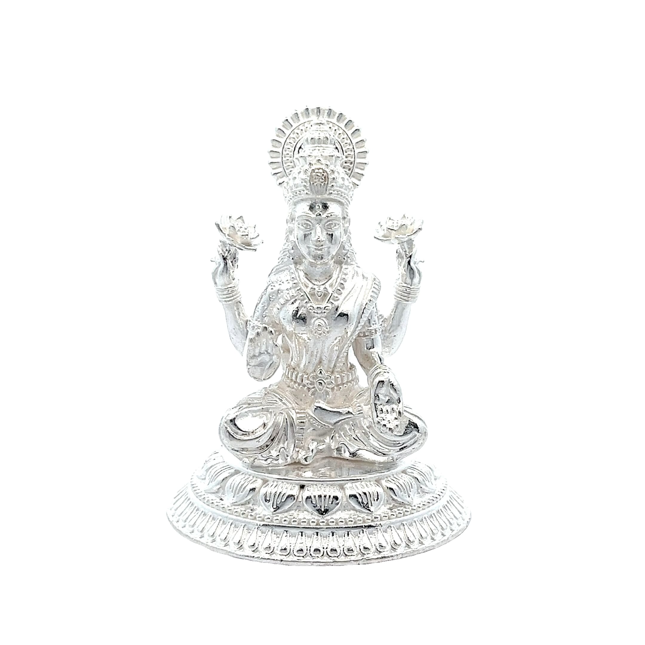 A beautifully sculpted silver idol of Goddess Lakshmi, seated in divine grace, symbolising abundance, fortune, and prosperity in your sacred space.