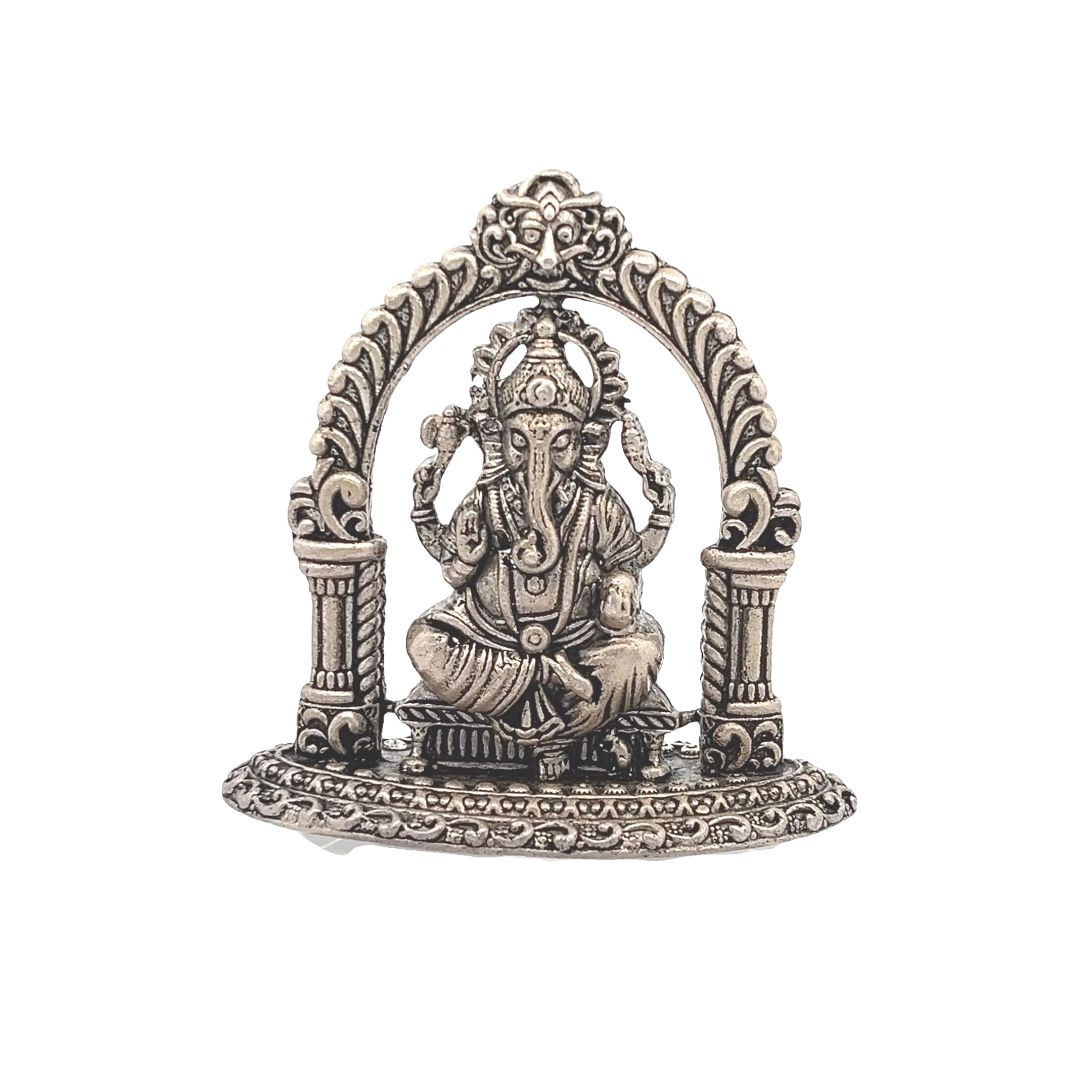 An intricately designed oxidised silver Ganesha idol seated beneath an ornate arch, representing wisdom, prosperity, and new beginnings.