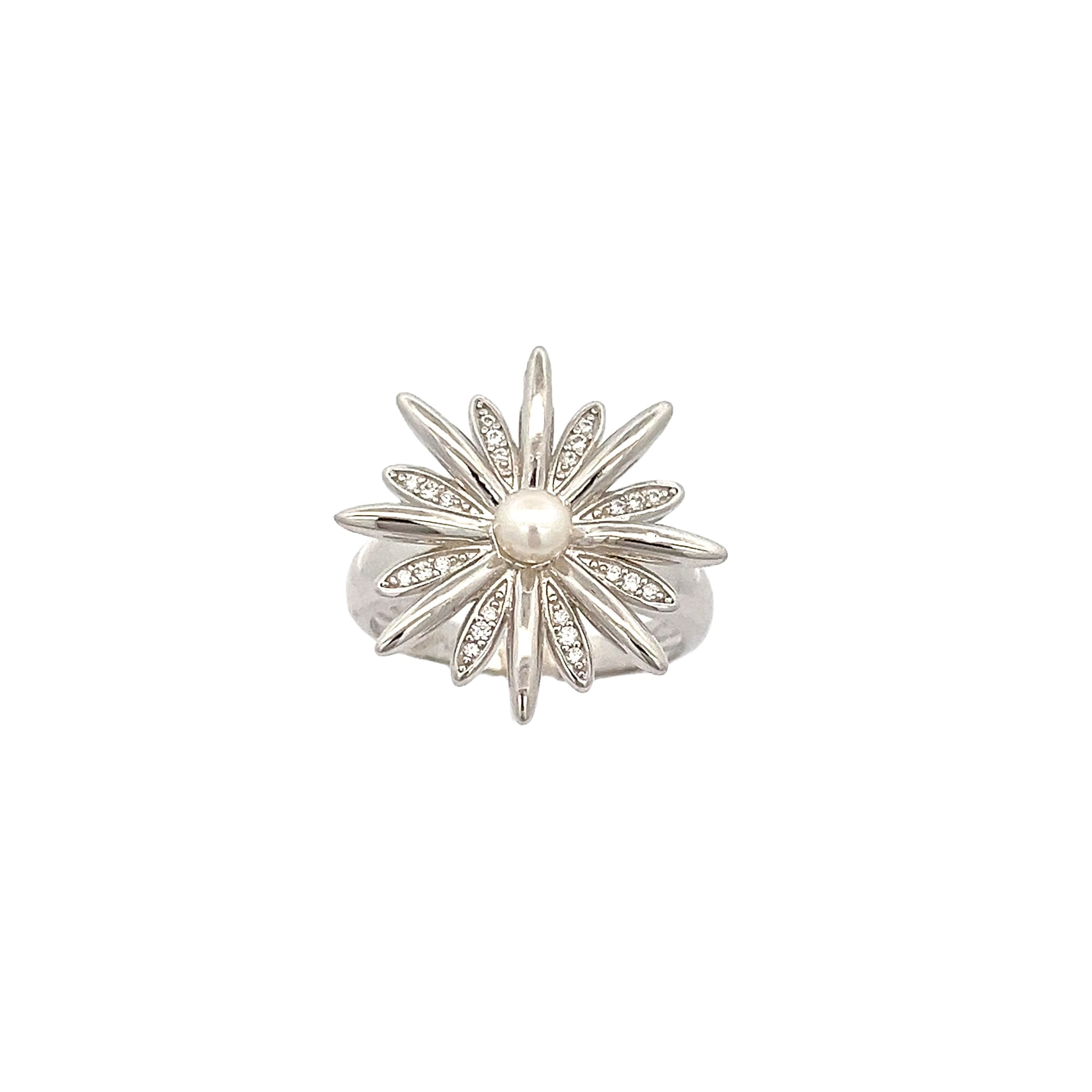 The Astrid Ring dazzles like a star with its pearl centre encircled by silver rays and shimmering stones. A symbol of strength and serenity, this statement piece evokes a cosmic sense of wonder—perfect for those who light up every room.