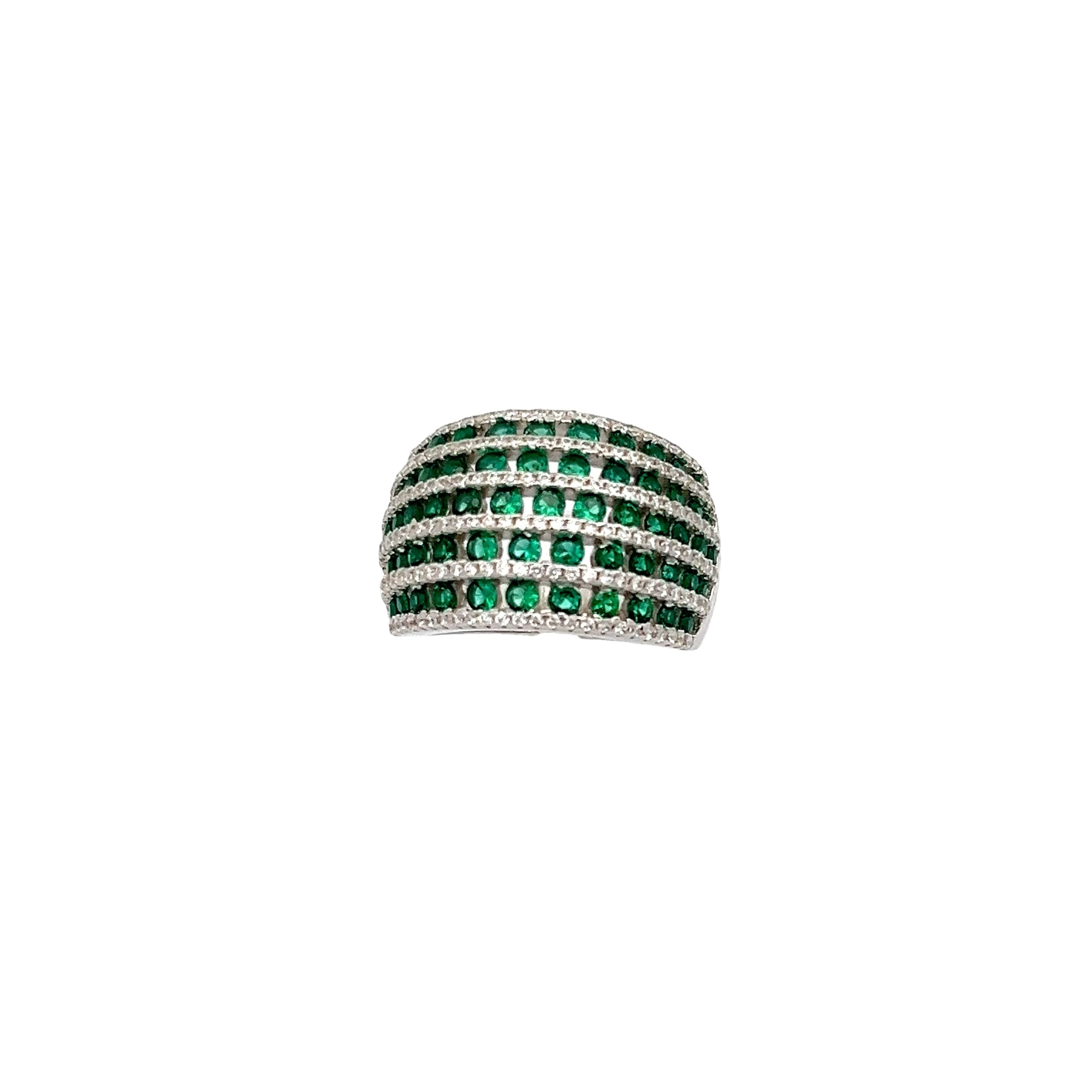 The Elira Ring channels regal charm through a wide, structured band layered with rows of green emeralds and diamond accents. Its elevated design adds a sense of strength and sophistication, perfect for the modern princess with timeless taste.
